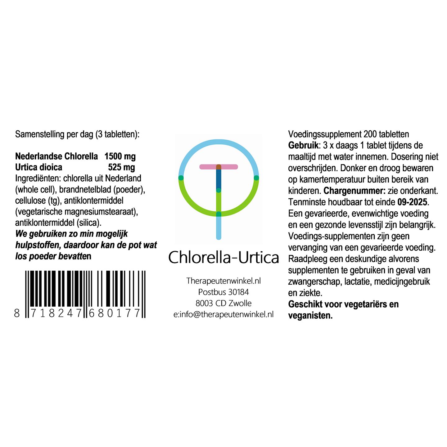 Nederlandse Chlorella (Whole cell), Brandnetel (Urtica dioica) blad poeder, Vulstof (Cellulose), Antiklontermiddelen (Vegetarische magnesiumstearaat, Silica).