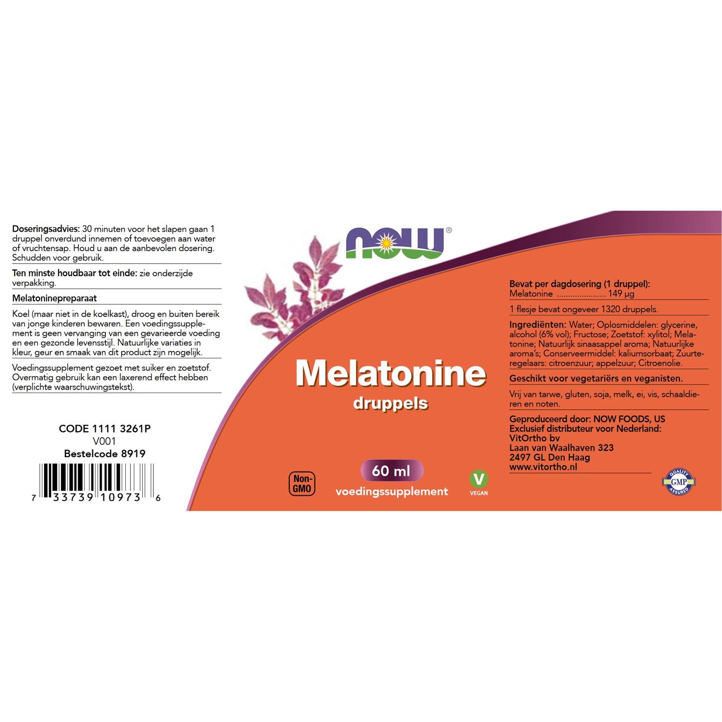 Water, Oplosmiddelen (Glycerine, Alcohol), Fructose, Zoetstof (Xylitol), Melatonine, Natuurlijk sinaasappel aroma, Natuurlijke aroma's, Conserveermiddel (Kaliumsorbaat), Zuurteregelaars (Citroenzuur, Appelzuur), Citroenolie.