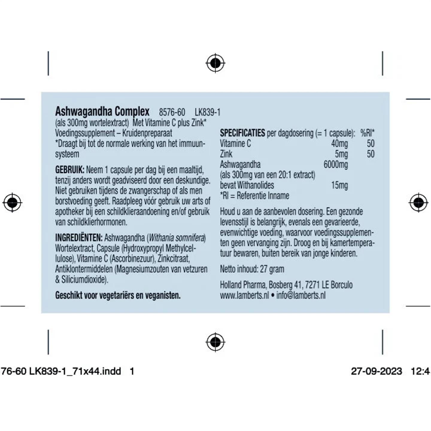 Ashwagandha (Withania somnifera) wortelextract, Capsule (Hydroxypropylmethylcellulose), Vitamine C (ascorbinezuur), Zinkcitraat, Antiklontermiddelen (Magnesiumzouten van vetzuren, Siliciumdioxide).