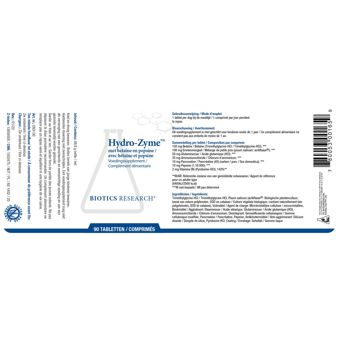 Betaïne HCl (trimethylglycine HCl), Erwtenmengsel (Pisum sativum: actiVbase®), Vulstof (Microkristallijne cellulose), Bindmiddel (Stearinezuur), Glutaminezuur (HCl), Ammoniumchloride, Desintegratiemiddel (Gemodificeerd cellulosegom), Pancreatine, Pepsine, Antiklontermiddel (Siliciumdioxide), Vitamine B6 (pyridoxine HCl), Coating (Schellak).