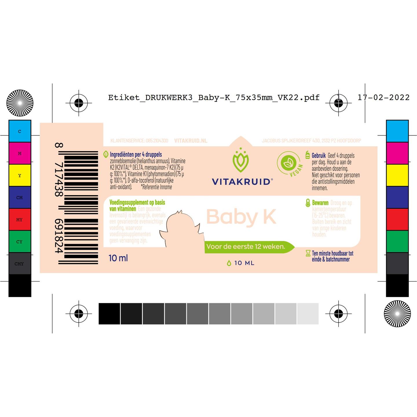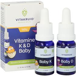 Baby K: Zonnebloemolie (Helianthus annuus), Vitamine K2 (K2Vital® DELTA, menaquinon-7 K2), Vitamine K1 (phytomenadion), Natuurlijke antioxidant (D-alfa-tocoferol), Baby D: Zonnebloemolie (Helianthus annuus), Vitamine D3 (cholecalciferol), Natuurlijke antioxidant (D-alfa-tocoferol).