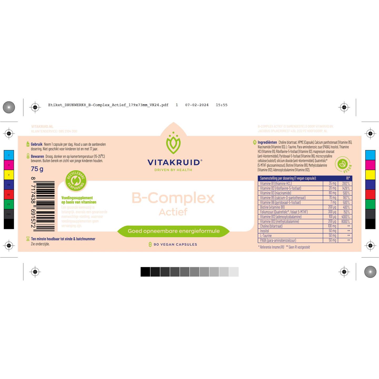 Cholinebitartraat, Capsule (HPMC), Calcium panthotenaat (Vitamine B5), Niacinamide (vitamine B3), L-Taurine, Para-aminobenzoic zuur (PABA), Inositol, Thiamine HCl (Vitamine B1), Riboflavine-5-fosfaat (Vitamine B2), Antiklontermiddel (Magnesiumstearaat), Pyridoxaal-5-fosfaat (Vitamine B6), Vulstof (Microcrystalline cellulose), Antiklontermiddel (Siliciumdioxide), Quatrefolic® (5-MTHF glucosaminezout), Biotine (vitamine B8), Methylcobalamine (vitamine B12), Adenosylcobalamine (Vitamine B12).