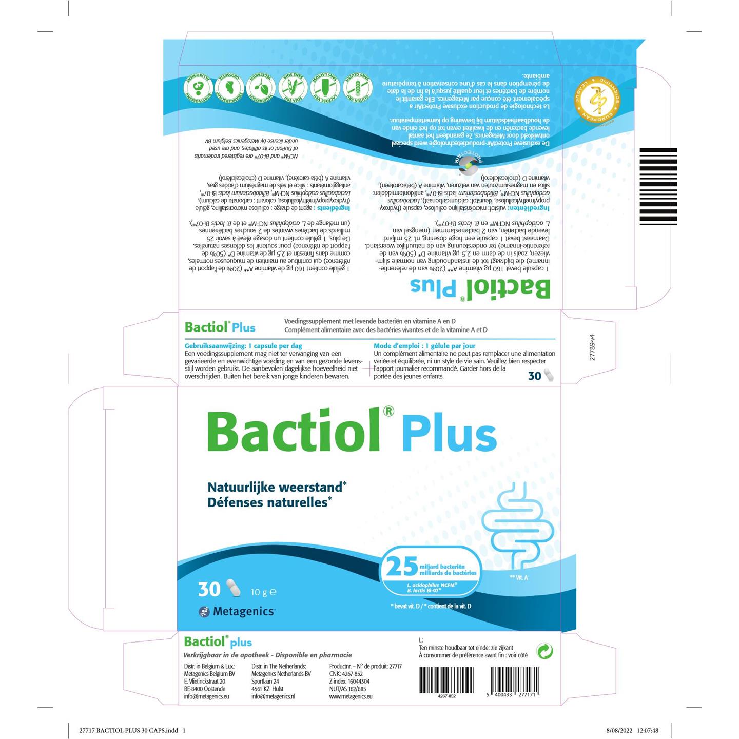 Vulstof (Microkristallijne cellulose), Capsule (Hydroxypropylmethylcellulose, Kleurstof: Calciumcarbonaat), Lactobacillus acidophilus, Bifidobacterium lactis, Antiklontermiddelen (Silica, Magnesiumzouten van vetzuren), Vitamine A (bètacaroteen), Vitamine D3 (cholecalciferol).