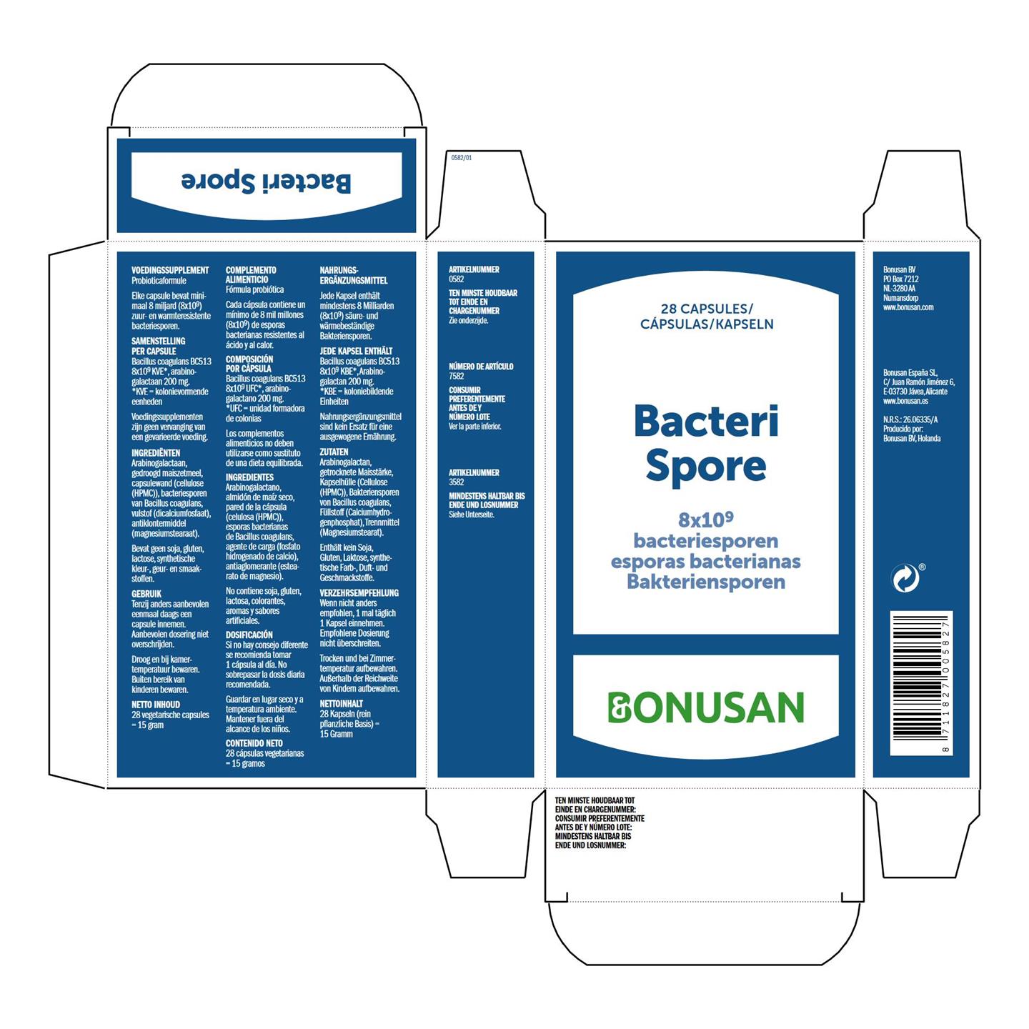 Arabinogalactaan, Gedroogd maïszetmeel, Capsule (Cellulose (Hydroxypropylmethylcellulose)), Bacteriesporen van Bacillus coagulans, Vulstof (Dicalciumfosfaat), Antiklontermiddel (Magnesiumstearaat).