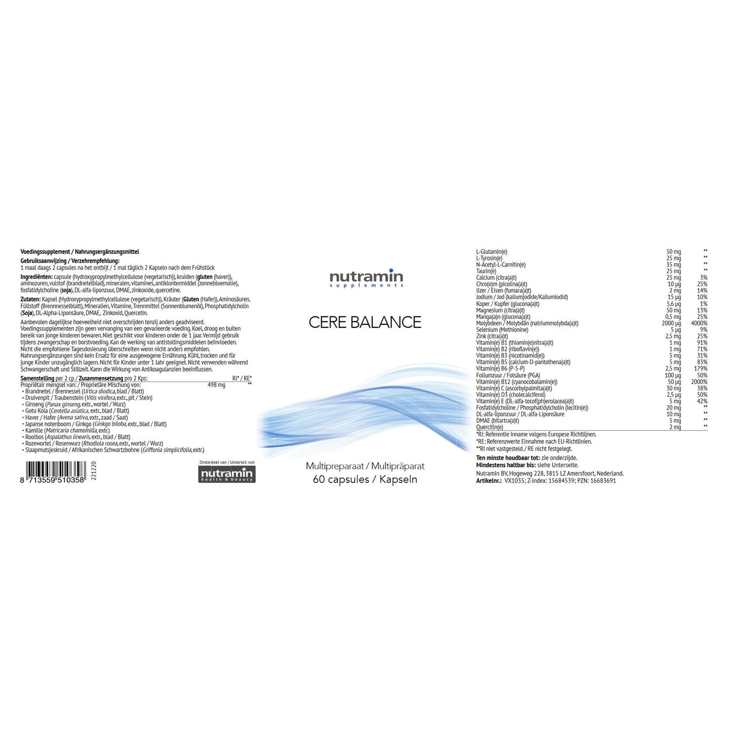 Capsule (Hydroxypropylmethylcellulose (vegetarisch)), Kruiden ((Gluten), Haver), Aminozuren, Vulstof (Brandnetelblad), Mineralen, Vitamines, Antiklontermiddel (Zonnebloemolie), Fosfatidylcholine (Soja), DL-alfa-liponzuur, DMAE, Zinkoxide, Quercetine.