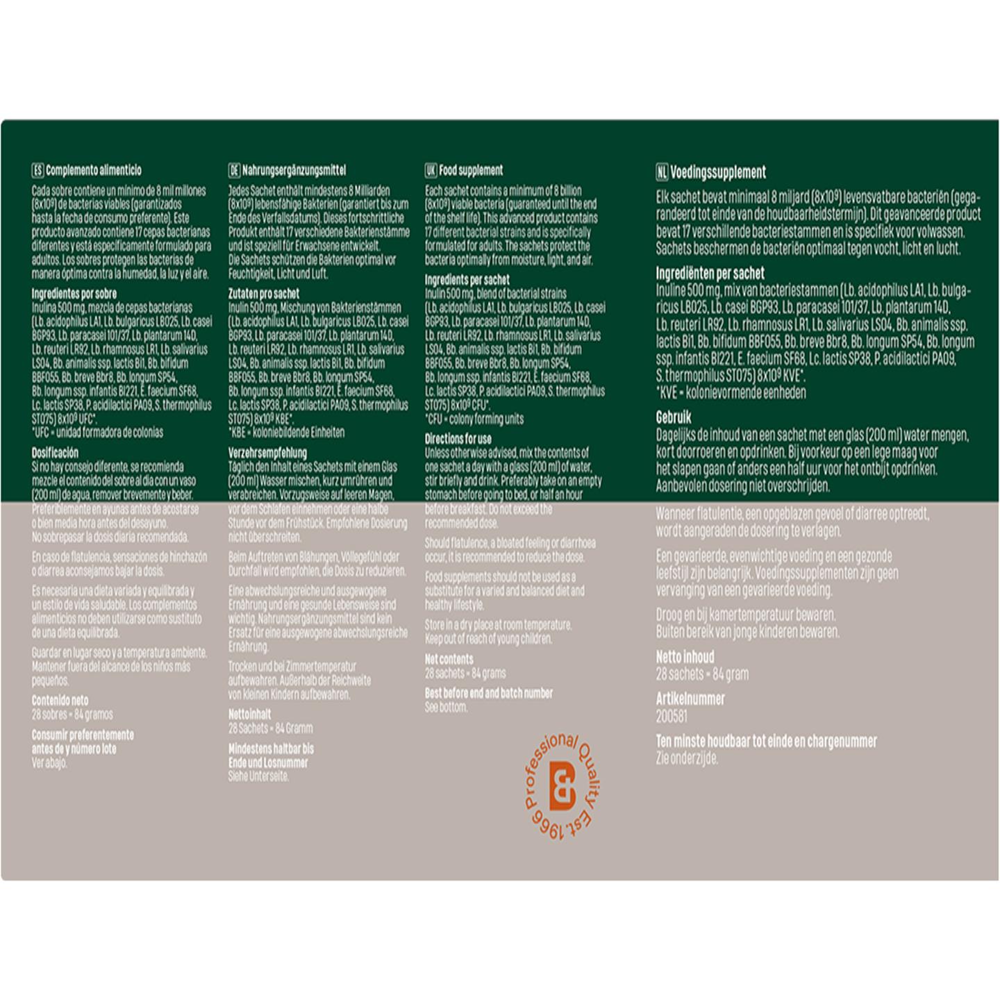 Inuline, Mix van bacteriestammen (Lb. acidophilus LA1, Lb. bulgaricus LB025, Lb. casei BGP93, Lb. paracasei 101/37, Lb. plantarum 14D, Lb. reuteri LR92, Lb. rhamnosus LR1, Lb. salivarius LS04, Bb. animalis spp lactis Bi1, Bb. bifidum BBF055, Bb. breve Bbr8, Bb. longum SP54, Bb. longum ssp. infantis Bl221, E. faecium SF68, Lc. lactis SP38, P. acidilactici PA09, S. thermophilus ST075).Waarschuwing