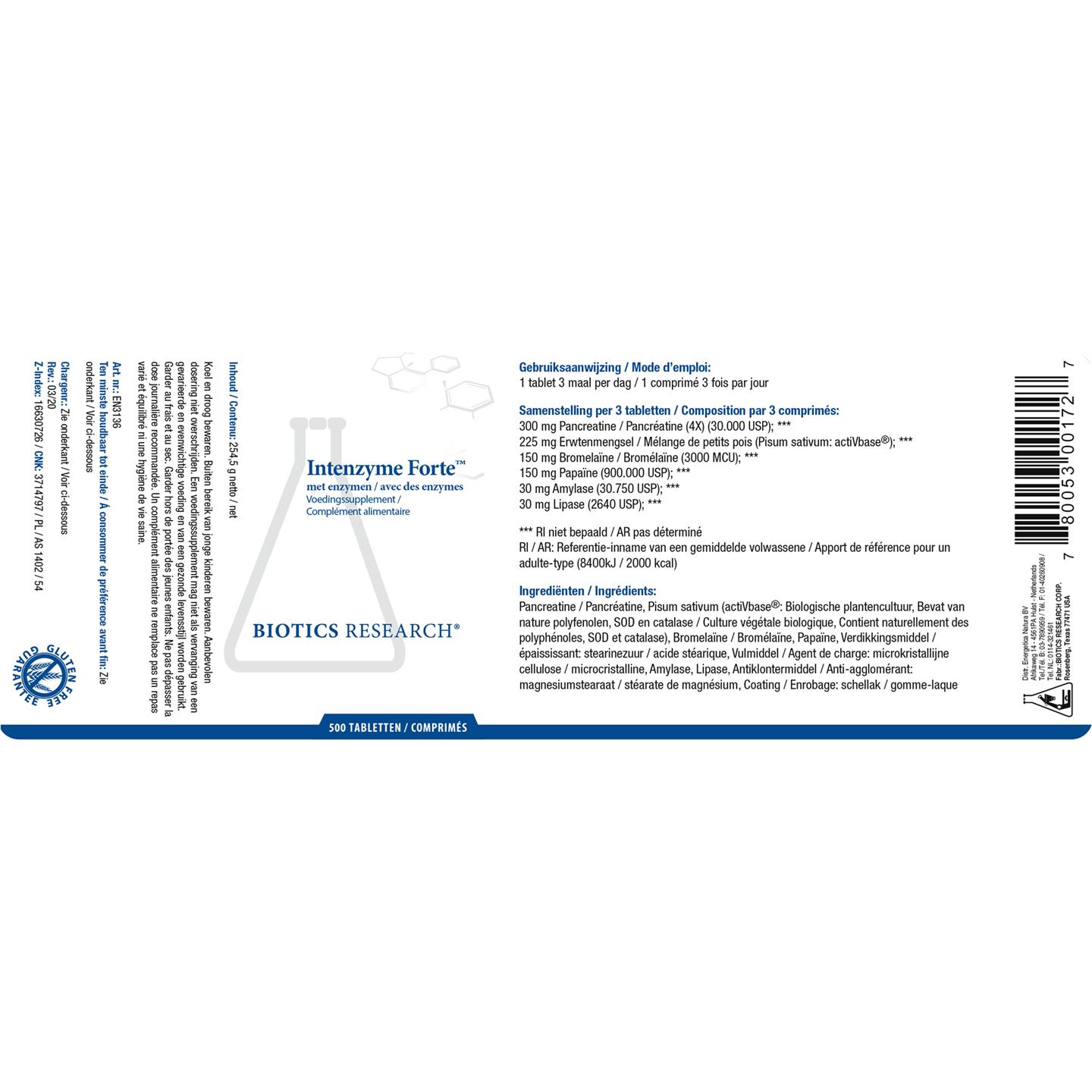 Pancreatine, Erwtenmengsel (Pisum sativum: actiVbase®), Bromelaïne, Papaïne, Bindmiddel (Stearinezuur), Vulstof (Microkristallijne cellulose), Amylase, Lipase, Antiklontermiddel (Magnesiumstearaat), Coating (Schellak).