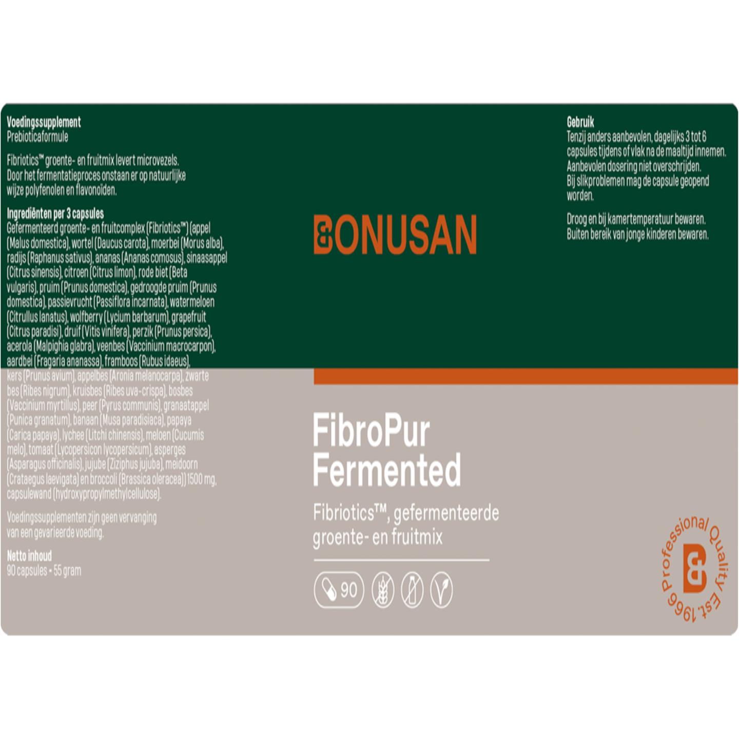Gefermenteerd groente- en fruitcomplex (Fibriotics™) (Appel (Malus domestica), Wortel (Daucus carota), Moerbei (Morus alba), Radijs (Raphanus sativus), Ananas (Ananas comosus), Sinaasappel (Citrus sinensis), Citroen (Citrus limon), Rode biet (Beta vulgaris), Pruim (Prunus domestica), Gedroogde pruim (Prunus domestica), Passievrucht (Passiflora incarnata), Watermeloen (Citrullus lanatus), Wolfberry (Lycium barbarum), Grapefruit (Citrus paradisi), Druif (Vitis vinifera), Perzik (Prunus persica), Acerola (Malpighia glabra), Veenbes (Vaccinium macrocarpon), Aardbei (Fragaria ananassa), Framboos (Rubus idaeus), Kers (Prunus avium), Appelbes (Aronia melanocarpa), Zwarte bes (Ribes nigrum), Kruisbes (Ribes uva-crispa), Bosbes (Vacciium myrtillus), Peer (Pyrus communis), Granaatappel (Punica granatum), Banaan (Musa paradisiaca), Papaya (Carica papaya), Lychee (Litchi chinensis), Meloen (Cucumis melo), Tomaat (Lycopersicon lycopersicum), Asperges (Asparagus officinalis), Jujube (Ziziphus jujuba), Meidoorn (Crataegus laevigata), Broccoli (Brassica oleracea)), Capsulewand (Hydroxypropylmethylcellulose).