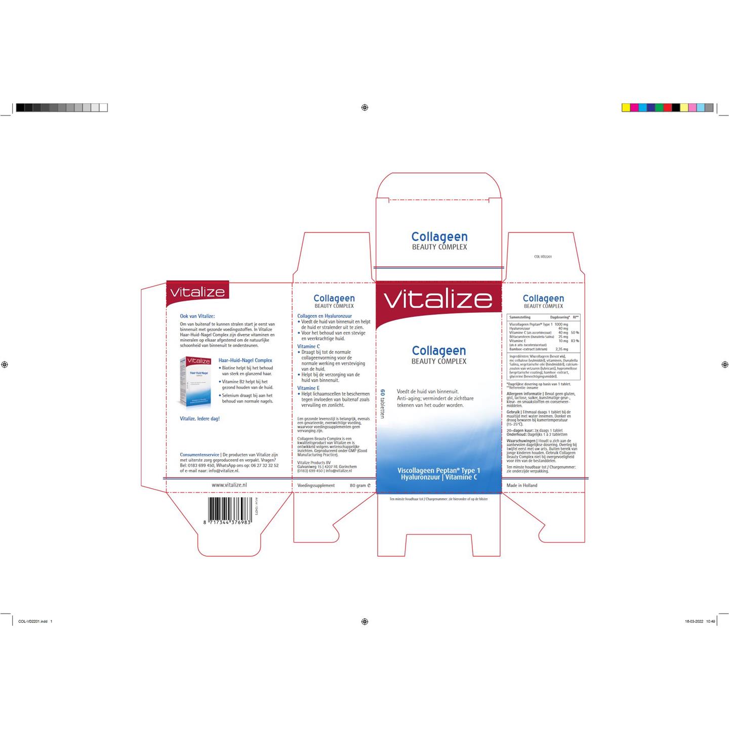 Viscollageen Peptan® Type I (Vis), Vulstof (Microkristallijne cellulose), Vitaminen, Bètacaroteen (Dunaliella salina), Bindmiddel (Vegetarische olie), Smeermiddel (Calciumzouten van vetzuren), Vegetarische coating (Hypromellose), Bamboe (silicium) extract, Bevochtigingsmiddel (Glycerine).