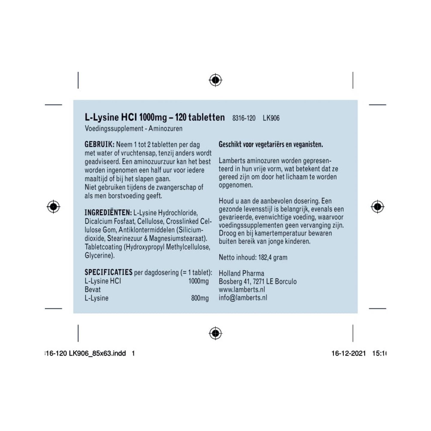 L-Lysine HCl, Dicalciumfosfaat, Cellulose, Crosslinked cellulose gom, Antiklontermiddelen (Siliciumdioxide, Stearinezuur, Magnesiumstearaat), Tabletcoating (Hydroxypropylmethylcellulose, Glycerine).