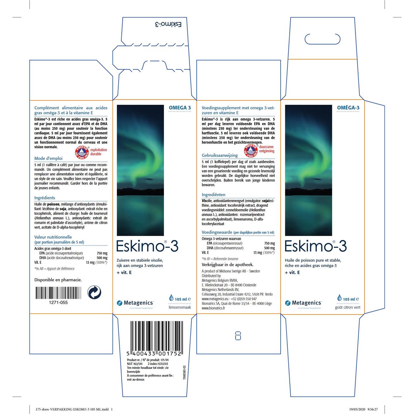 Visolie (Vis), Antioxidantenmengsel, Emulgator: (Sojalecithine, (Soja)), Antioxidant: (Tocoferolrijk extract), Dragend voedingsmiddel: (Zonnebloem (Helianthus annuus) olie), Antioxidanten: (Rozemarijn extract, Ascorbylpalmitaat), Limoen aroma, Vitamine E (d-alfatocoferylacetaat).