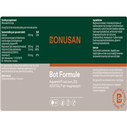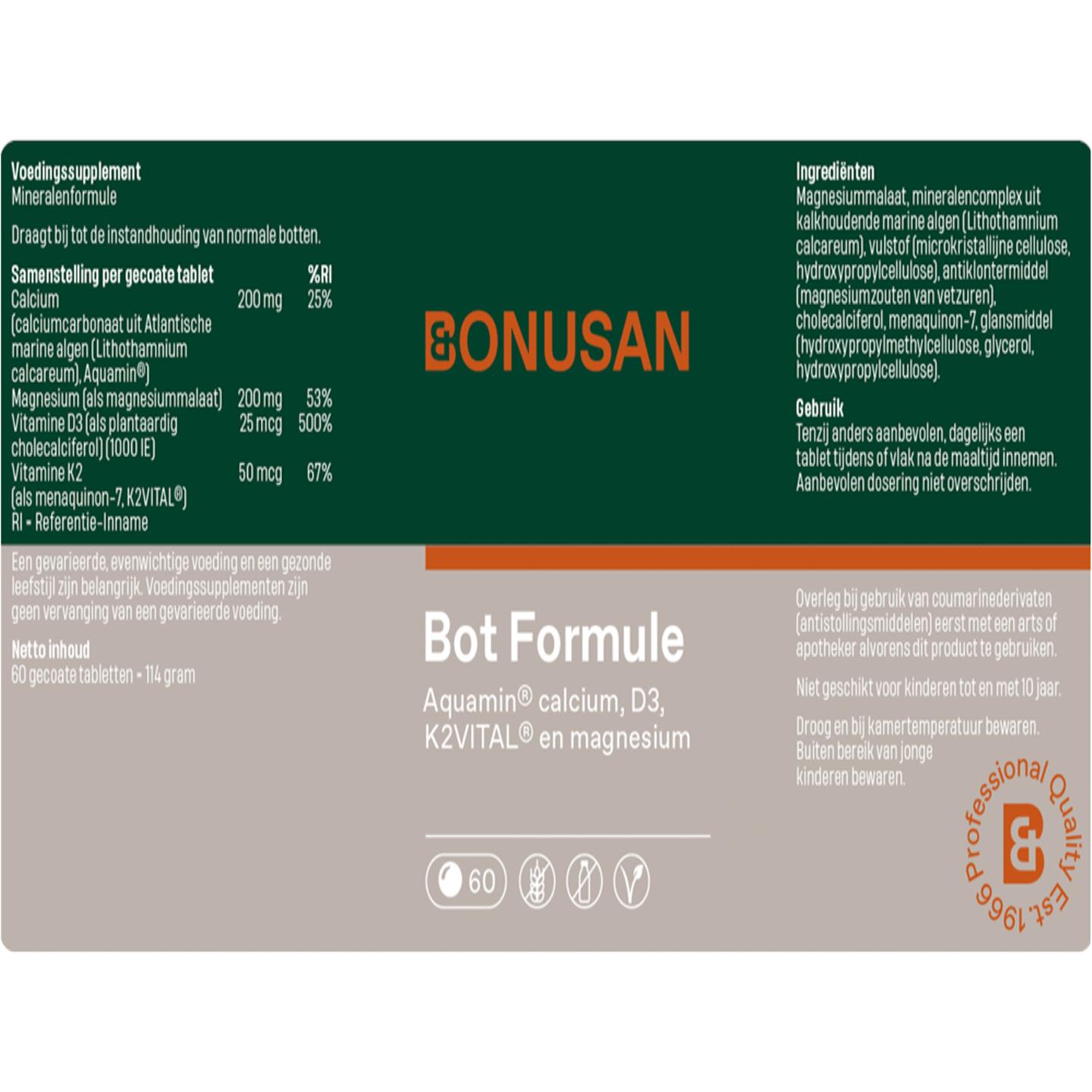 Magnesiummalaat, Mineralencomplex uit kalkhoudende marine algen (Lithothamnium calcareum), Vulstof (Microkristallijne cellulose, Hydroxypropylcellulose), Antiklontermiddel (Magnesiumzouten van vetzuren), Cholecalciferol, Menaquinon-7, Glansmiddel (Hydroxypropylmethylcellulose, Glycerol, Hydroxypropylcellulose).