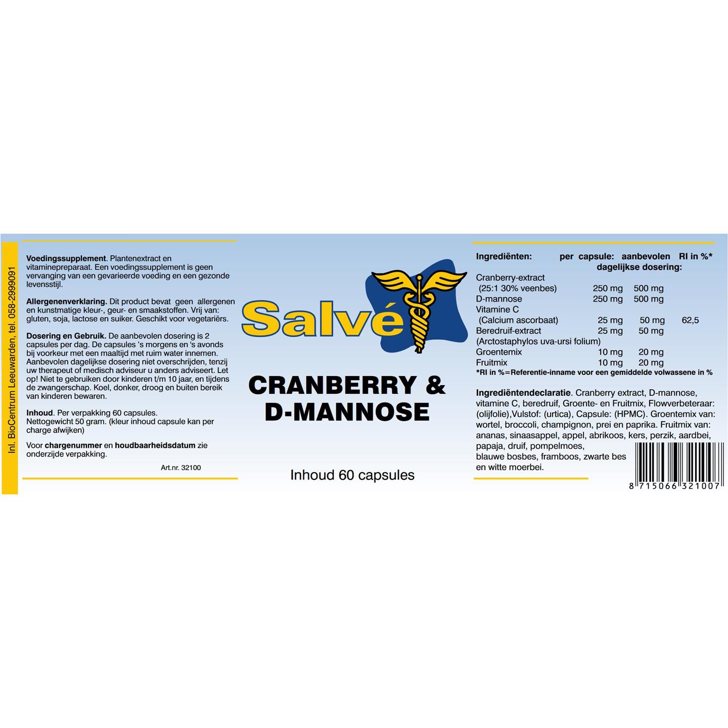 Cranberry extract, D-Mannose, Vitamine C (calciumascorbaat), Berendruif (Arctostaphylos uva-ursi) blad extract, Groentemix (Wortel, Broccoli, Champignon, Prei, Paprika), Fruitmix (Ananas, Sinaasappel, Appel, Abrikoos, Kers, Perzik, Aardbei, Papaja, Druif, Pompelmoes, Blauwe bosbes, Framboos, Zwarte bes, Witte moerbei), Flow verbeteraar (Olijfolie), Vulstof (Urtica), Capsule (Hydroxypropylmethylcellulose).