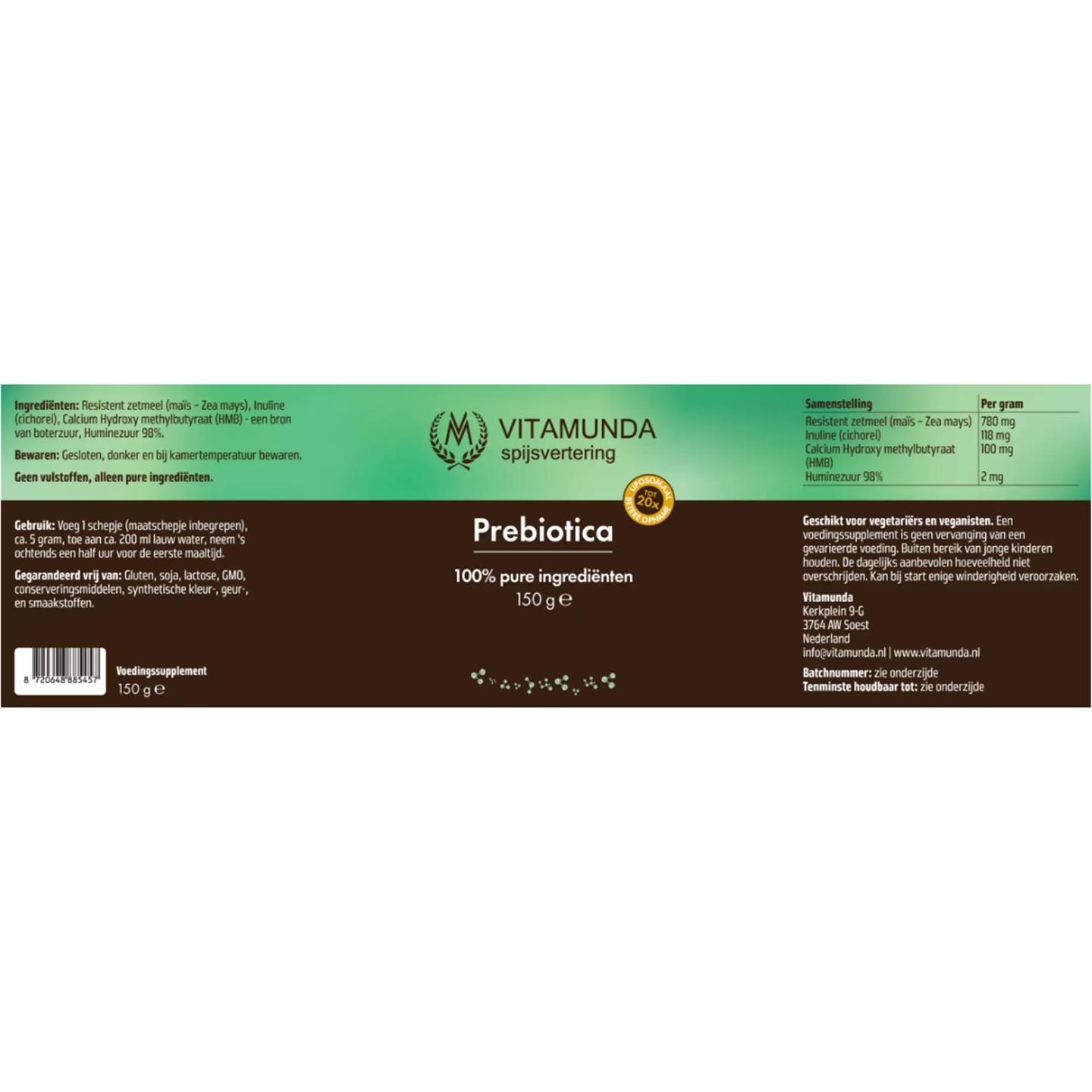 Resistent zetmeel (Maïs (Zea mays)), Inuline (Cichorei), Calciumhydroxymethylbutyraat (HMB) (Bron van boterzuur), Huminezuur.