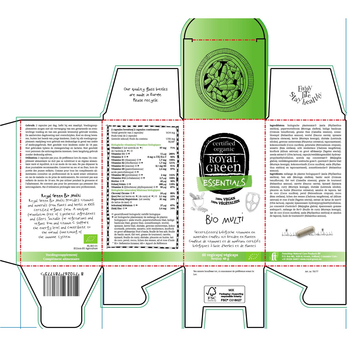 Biologische plantenmix ☼ (Amla (Phyllanthus emblica), Peperwortelboom (Moringa oleifera), Heilige basilicum (Ocimum tenuiflorum), Groene thee (Camellia sinensis), Zonnebloempit (Helianthus annuus), Wortel (Daucus carota), Spinazie (Spinacia oleracea), Kerrie (Murraya koenigii), Shiitake (Lentinula edodes), Gewone oesterzwam (Pleurotus ostreatus), Tapiocazetmeel, Kokosnootmelk (Cocos nucifera), Peterselie (Petroselinum crispum), Annatto (Bixa orellana), Echt rendiermos (Cladonia rangiferina), Knoflook (Allium sativum), Groot afrikaantje (Tagetes erecta)), Zeesla (Ulva lactuca) extract ☼, Capsule/verdikkingsmiddel (Hydroxypropylmethylcellulose), Acerola sap (Malpighia glabra) concentraat ☼, Verdikkingsmiddel (Arabische gom ☼), IJzermix ☼ (Kerrie blad (Murraya koenigii), Kokosnootmelk (Cocos nucifera), Amla (Phyllanthus emblica), Tapiocazetmeel), Zonnebloemolie (Helianthus annuus) ☼.