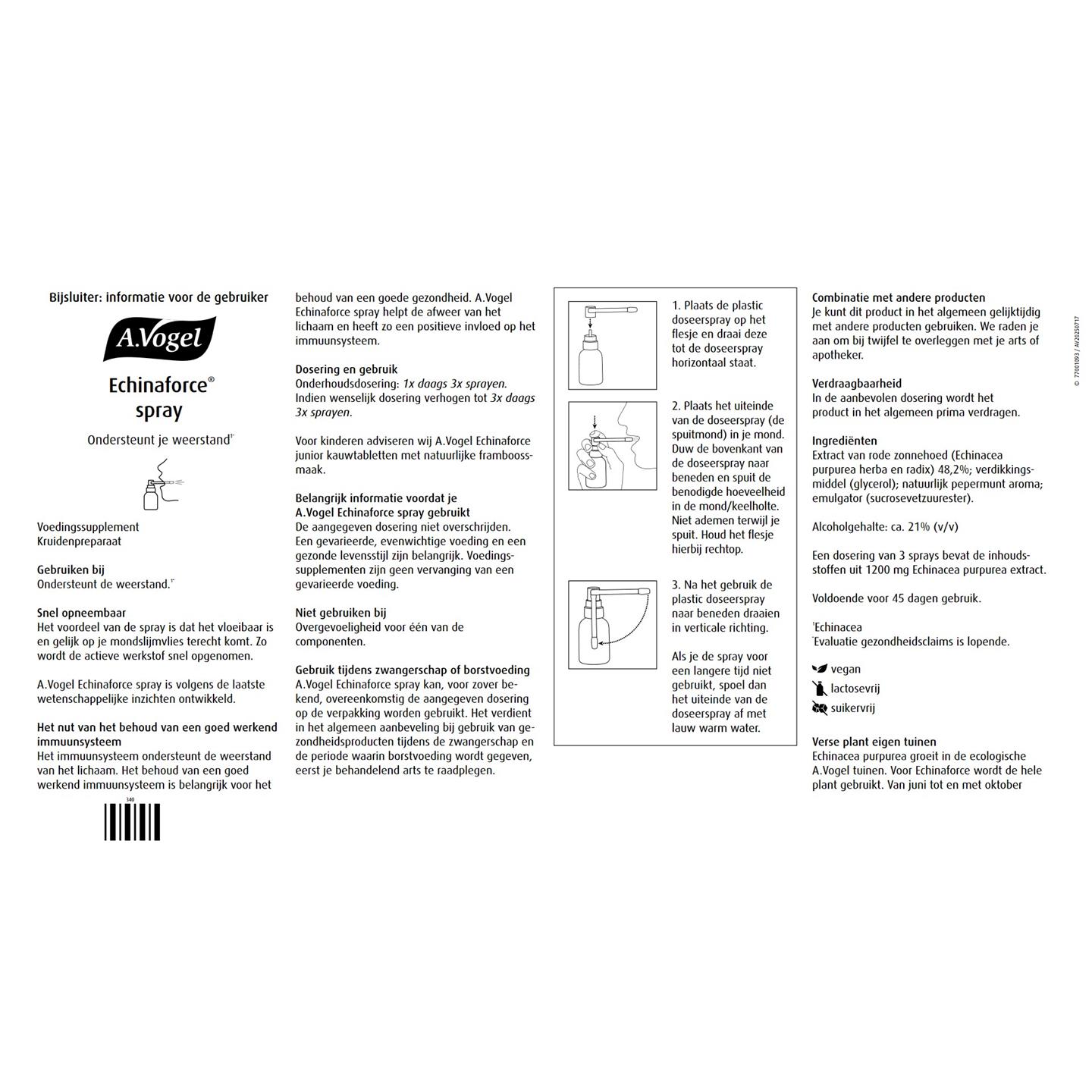 Extract van rode zonnehoed (Echinacea purpurea herba en radix) 48,2%, Verdikkingsmiddel (Glycerol), Natuurlijk pepermunt aroma, Emulgator (Sucrosevetzuurester).