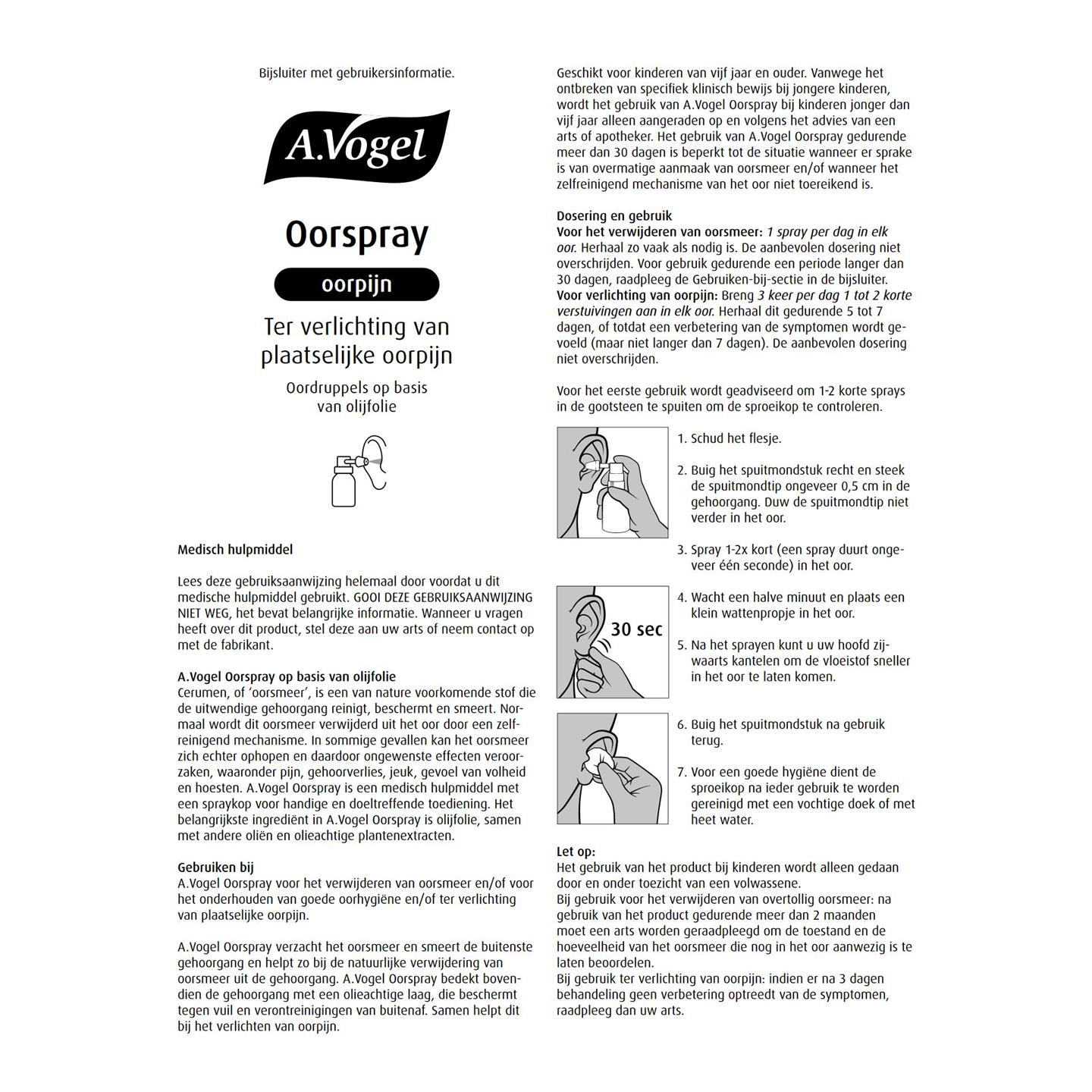 Voor verlichting van oorpijn: breng 3 maal per dag 1-2 korte verstuivingen aan in elk oor. Herhaal dit gedurende 5-7 dagen, of tot dat een verbetering van de symptomen wordt gevoeld (maar niet langer dan 7 dagen). De aanbevolen dagdosering niet overschrijden. Lees voor gebruik de gebruiksaanwijzing.