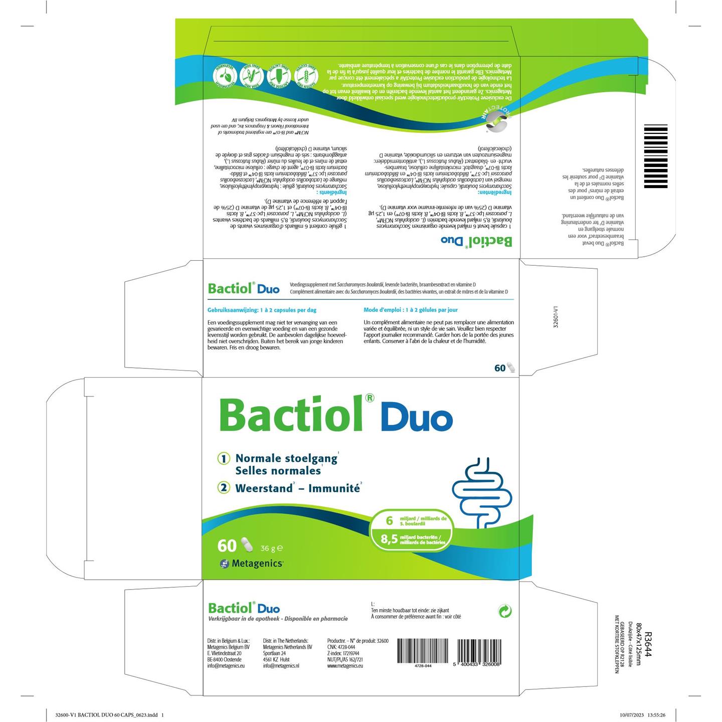 Saccharomyces boulardii, Capsule (Hydroxypropylmethylcellulose), Lactobacillus acidophilus, Lactobacillus paracasei, Bifidobacterium lactis, Draagstof (Microkristallijne cellulose), Braambes (Rubus fruticosus) vrucht- en bladextract, Antiklontermiddelen (Magnesiumzouten van vetzuren, Siliciumdioxide), Vitamine D3 (cholecalciferol).