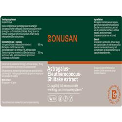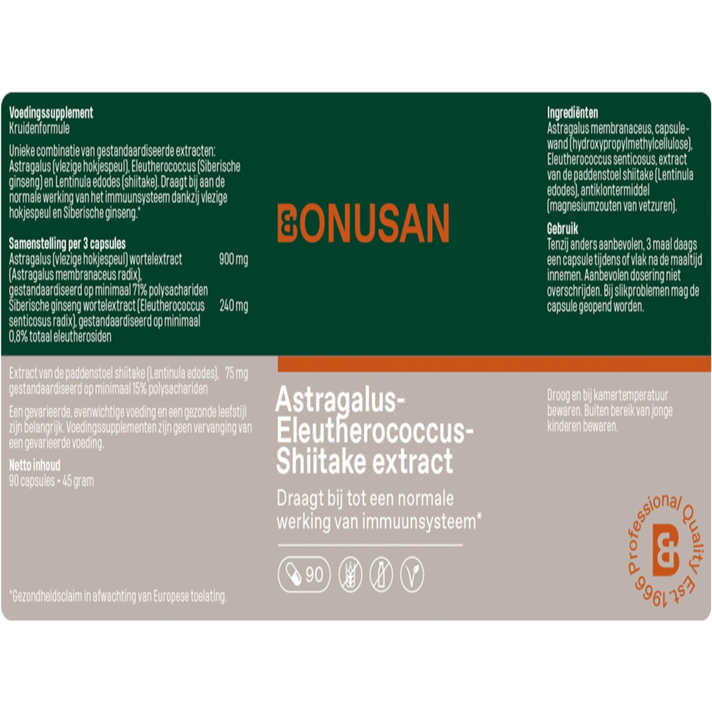Astragalus membranaceus, Capsulewand (Hydroxypropylmethylcellulose), Eleutherococcus senticosus, Extract van de paddenstoel shiitake (Lentinula edodes), Antiklontermiddel (Magnesiumzouten van vetzuren).