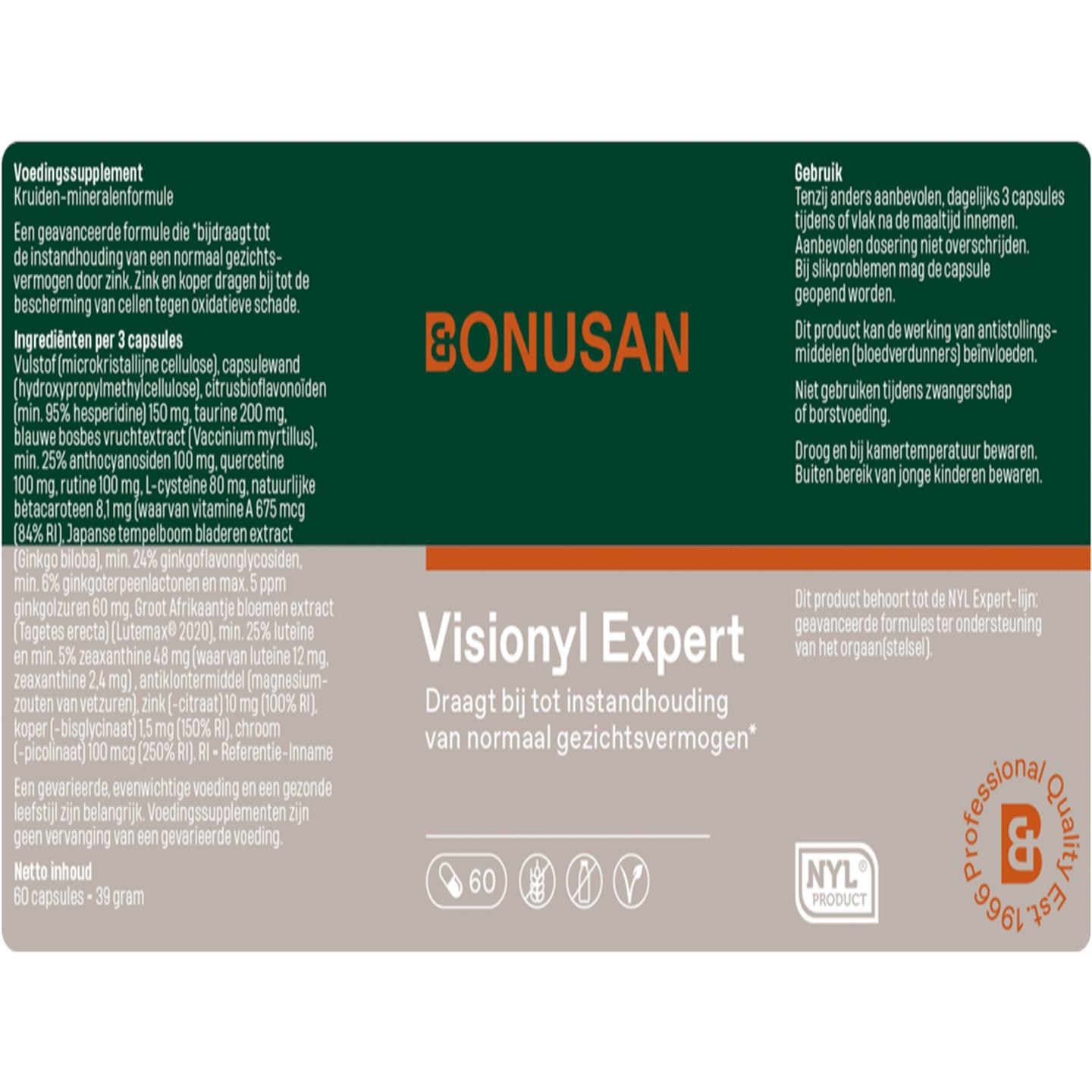 Vulstof (Microkristallijne cellulose), Capsulewand (Hydroxypropylmethylcellulose), Citrusbioflavonoïden, Taurine, Blauwe bosbes vruchtextract (Vaccinium myrtillus), Quercetine, Rutine, L-Cysteïne, Natuurlijke bètacaroteen, Japanse tempelboom bladeren extract (Ginkgo biloba), Groot Afrikaantje bloemen extract (Tagetes erecta) (Lutemax® 2020), Antiklontermiddel (Magnesiumzouten van vetzuren), Zink (citraat), Koper (bisglycinaat), Chroom (picolinaat).