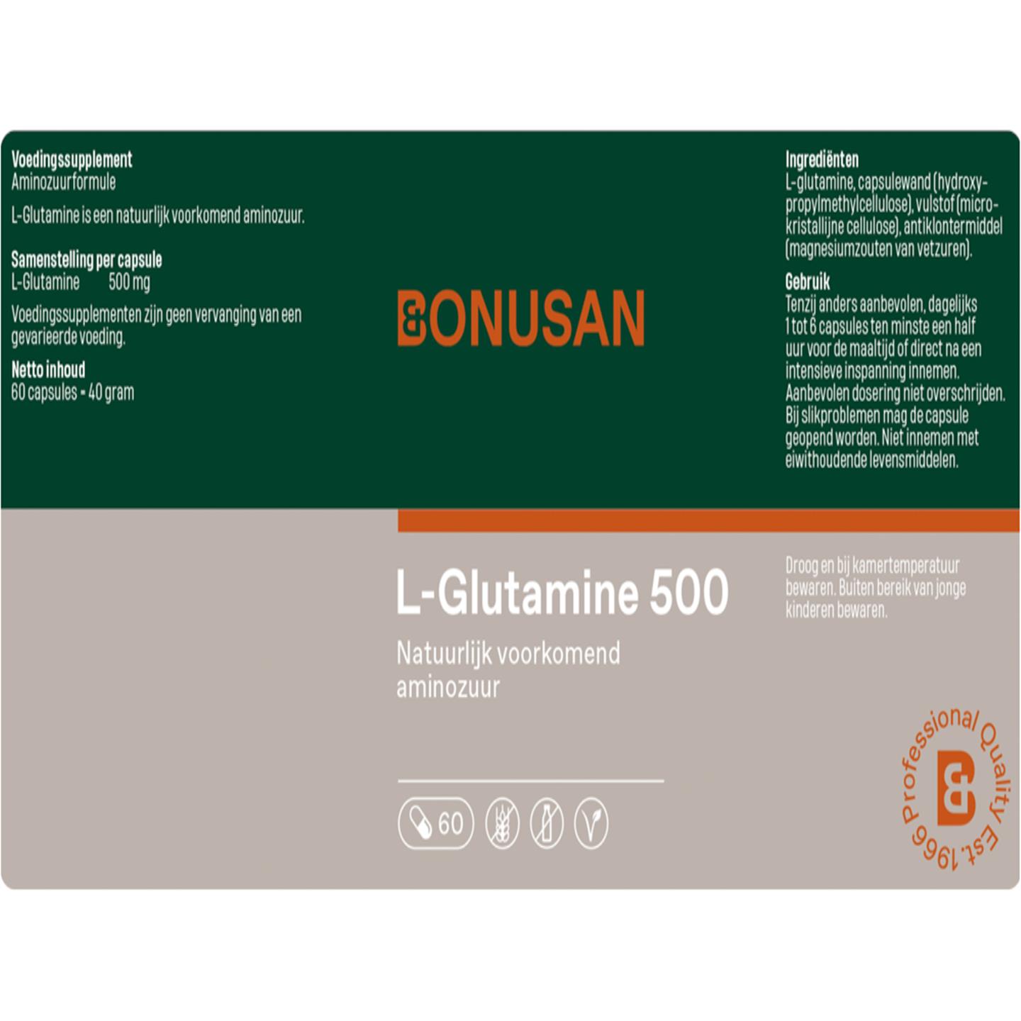 L-Glutamine, Capsulewand (Hydroxypropylmethylcellulose), Vulstof (Microkristallijne cellulose), Antiklontermiddel (Magnesiumzouten van vetzuren).