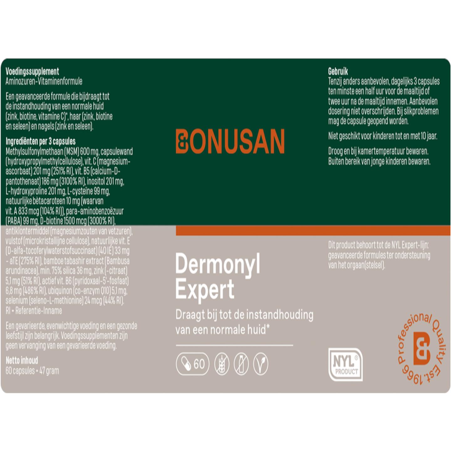 Methylsulfonylmethaan (MSM), Capsulewand (Hydroxypropylmethylcellulose), Vitamine C (magnesiumascorbaat), Vitamine B5 (calcium-d-pantothenaat), Inositol, L-Hydroxyproline, L-Cysteïne, Natuurlijke bètacaroteen, Para-aminobenzoëzuur (PABA), D-Biotine, Antiklontermiddel (Magnesiumzouten van vetzuren), Vulstof (Microkristallijne cellulose), Natuurlijke vitamine E (D-alfa-tocoferylwaterstofsuccinaat), Bamboe tabashir extract (Bambusa arundinacea), Zink (citraat), Actief vitamine B6 (pyridoxaal-5-fosfaat), Ubiquinon (co-enzym Q10), Selenium (seleno-l-methionine).