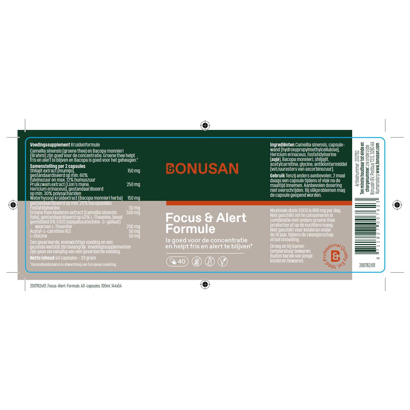 Camellia sinensis, Capsulewand (Hydroxypropylmethylcellulose), Hericium erinaceus, Fosfatidylserine (Soja), Bacopa monnieri, Shilajit, Acetylcarnitine, Glycine, Antiklontermiddel (Vetzuuresters van ascorbinezuur).
