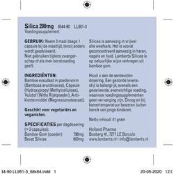Bamboe (Bambusa arundinacea) exsudaat in poedervorm, Capsule (Hydroxypropylmethylcellulose), Vulstof (Witte rijstpoeder), Antiklontermiddel (Magnesiumstearaat).