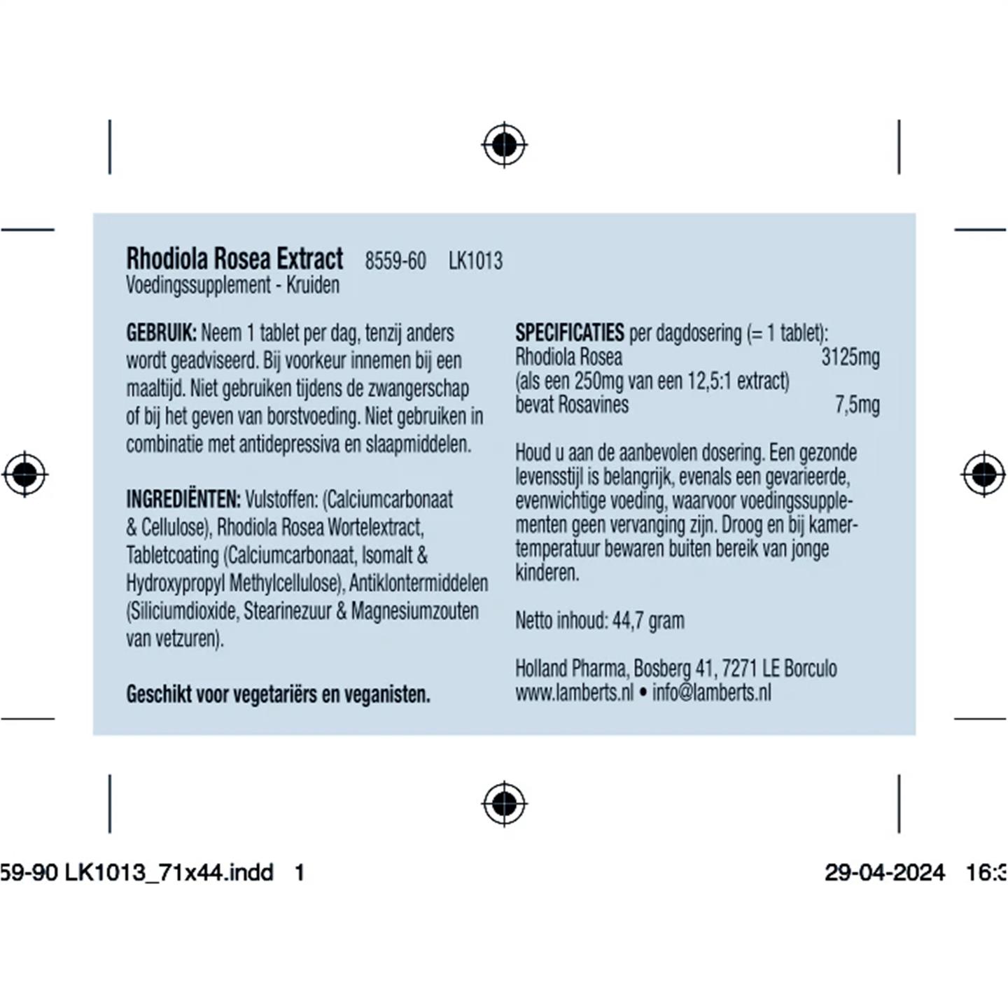 Vulstoffen: (Calciumcarbonaat, Cellulose), Rhodiola rosea wortel extract, Tabletcoating (Calciumcarbonaat, Isomalt, Hydroxypropylmethylcellulose), Antiklontermiddelen (Siliciumdioxide, Stearinezuur, Magnesiumzouten van vetzuren).