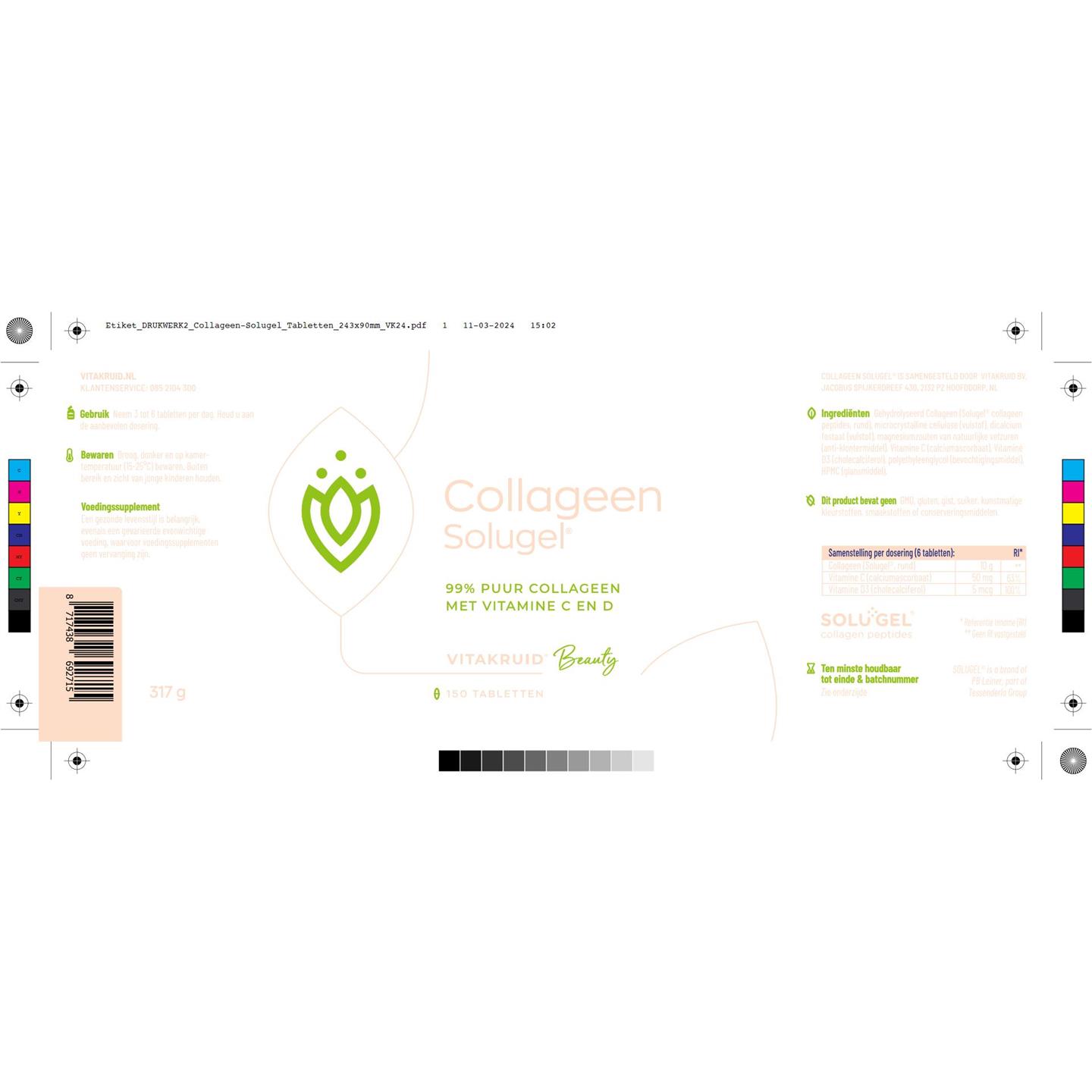 Gehydrolyseerd collageen (Solugel® collageen peptides, rund), Vulstoffen (Microcrystalline cellulose, Dicalciumfosfaat), Antiklontermiddel (Magnesiumzouten van natuurlijke vetzuren), Vitamine C (calciumascorbaat), Vitamine D3 (cholecalciferol), Bevochtigingsmiddel (Polyethyleenglycol), Glansmiddel (HPMC).