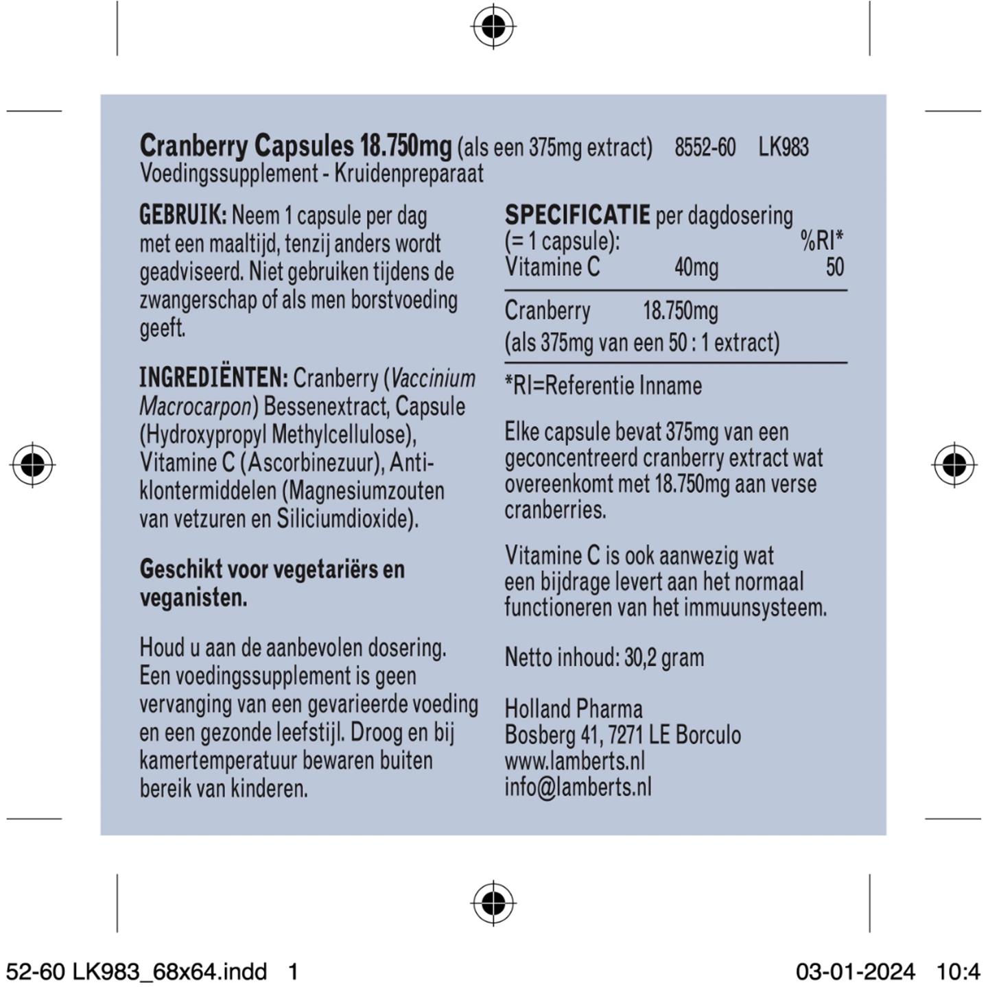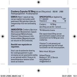 Cranberry (Vaccinium macrocarpon) bessen extract, Capsule (Hydroxypropylmethylcellulose), Vitamine C (ascorbinezuur), Antiklontermiddelen (Magnesiumzouten van vetzuren, Siliciumdioxide).