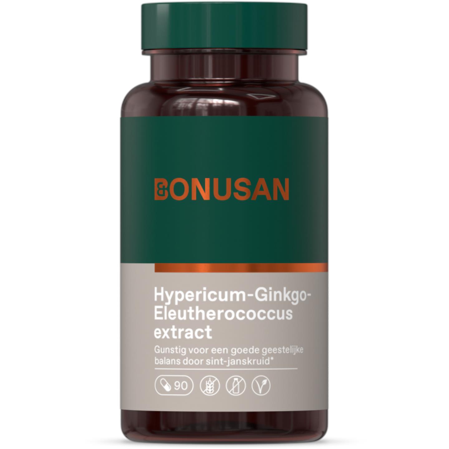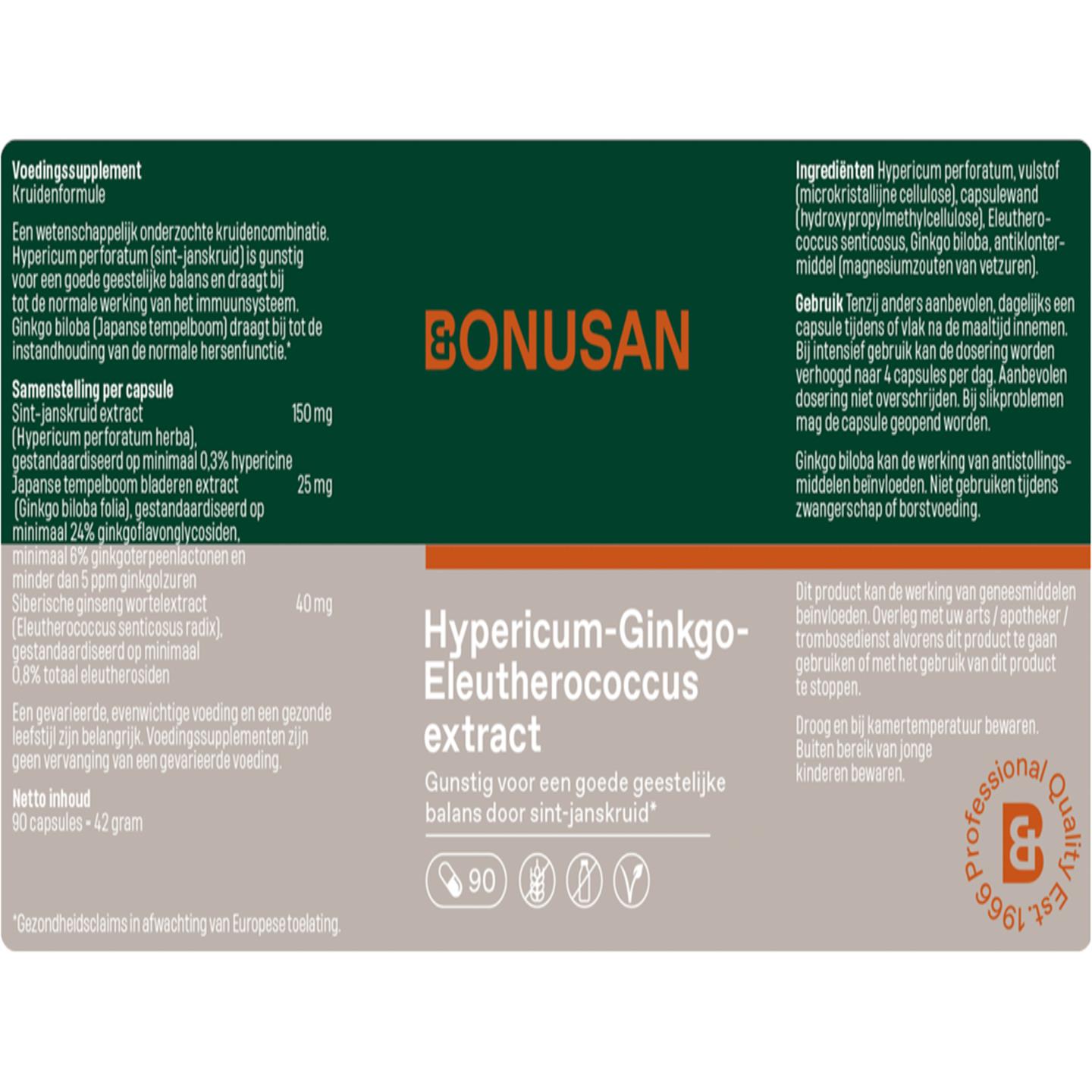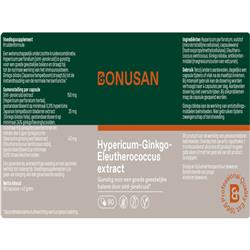 Hypericum perforatum, Vulstof (Microkristallijne cellulose), Capsulewand (Hydroxypropylmethylcellulose), Eleutherococcus senticosus, Ginkgo biloba, Antiklontermiddel (Magnesiumzouten van vetzuren).