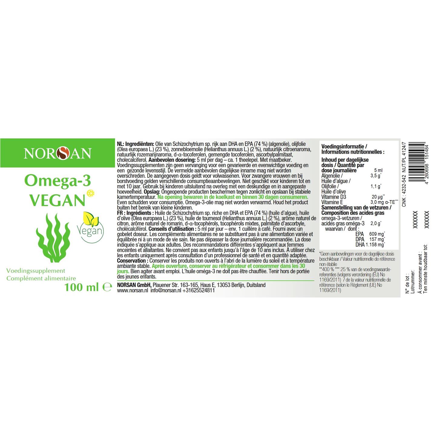 Olie van Schizochytrium sp. rijk aan DHA en EPA (74%) (algenolie), Olijfolie (Olea europaea L.) (23%), Zonnebloemolie (Helianthus annuus L.) (2%), Natuurlijk citroenaroma, Natuurlijk rozemarijnaroma, D-ɑ-tocoferolen, Gemengde tocoferolen, Ascorbylpalmitaat, Cholecalciferol.
