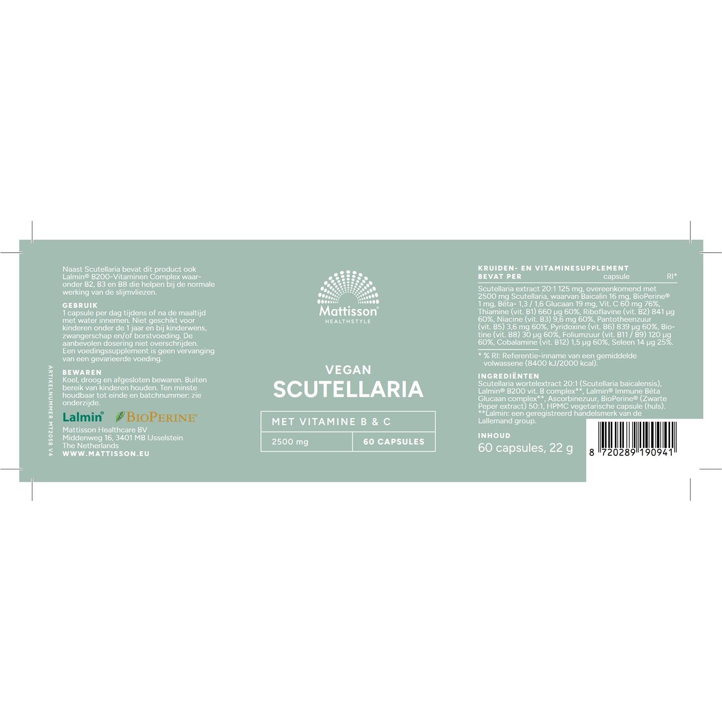 Scutellaria wortelextract 20:1 (Scutellaria baicalensis), Lalmin® B200 vitamine B complex, Lalmin® Immune Bèta Glucaan complex, Ascorbinezuur, BioPerine® (Zwarte Peper extract) 50:1, HPMC vegetarische capsule (huls).