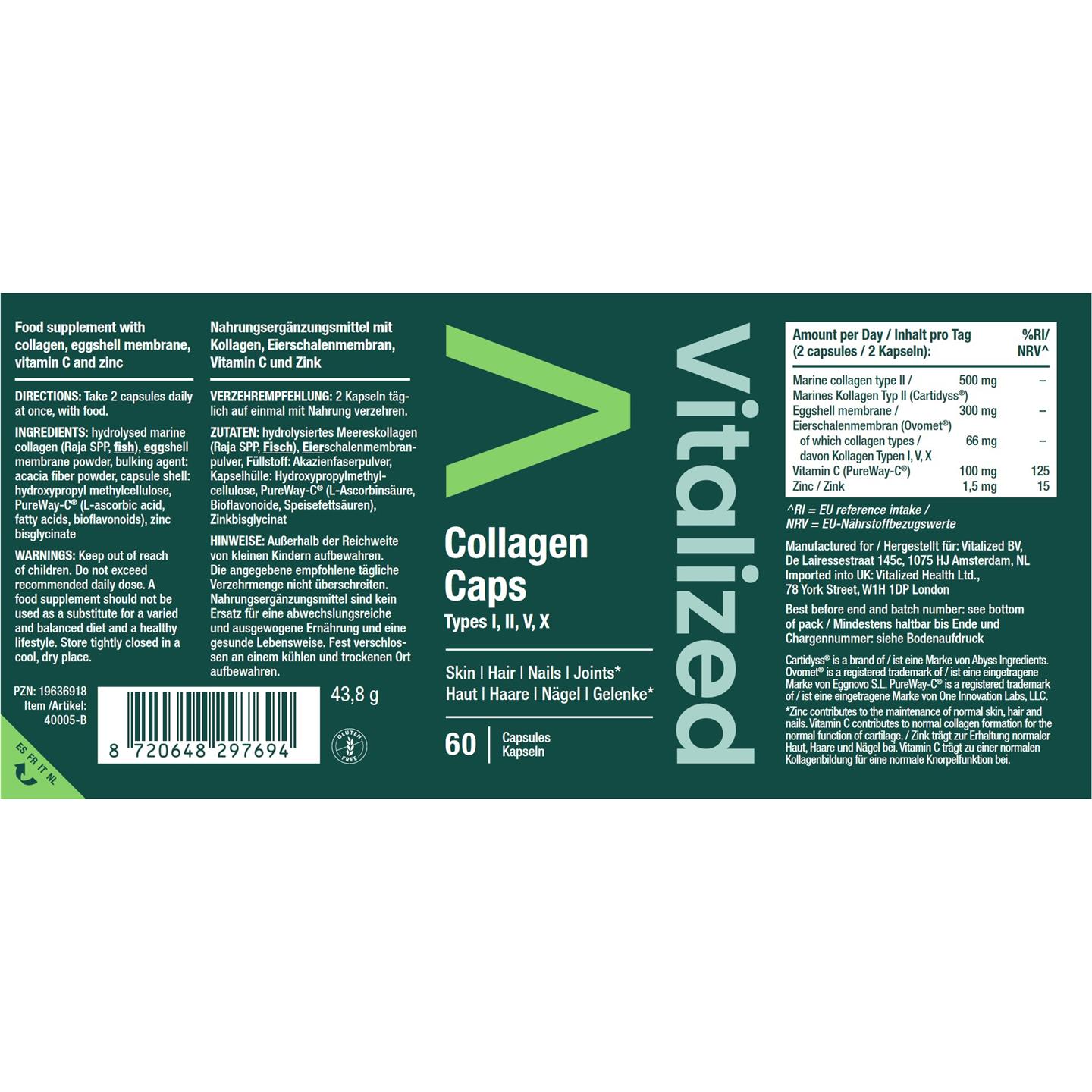 Gehydrolyseerd marien collageen (Raja SPP, (Vis)), Eierschaalmembraanpoeder (Eieren), Vulstof (Acaciavezelpoeder), Capsulehuls (Hydroxypropylmethylcellulose), PureWay-C® (L-ascorbinezuur, Bioflavonoïden, Vetzuren), Zinkbisglycinaat.