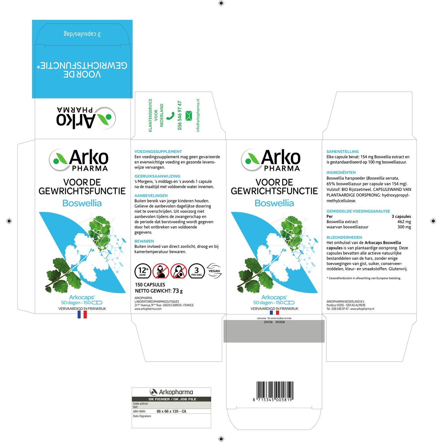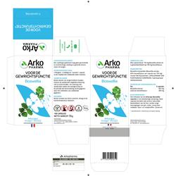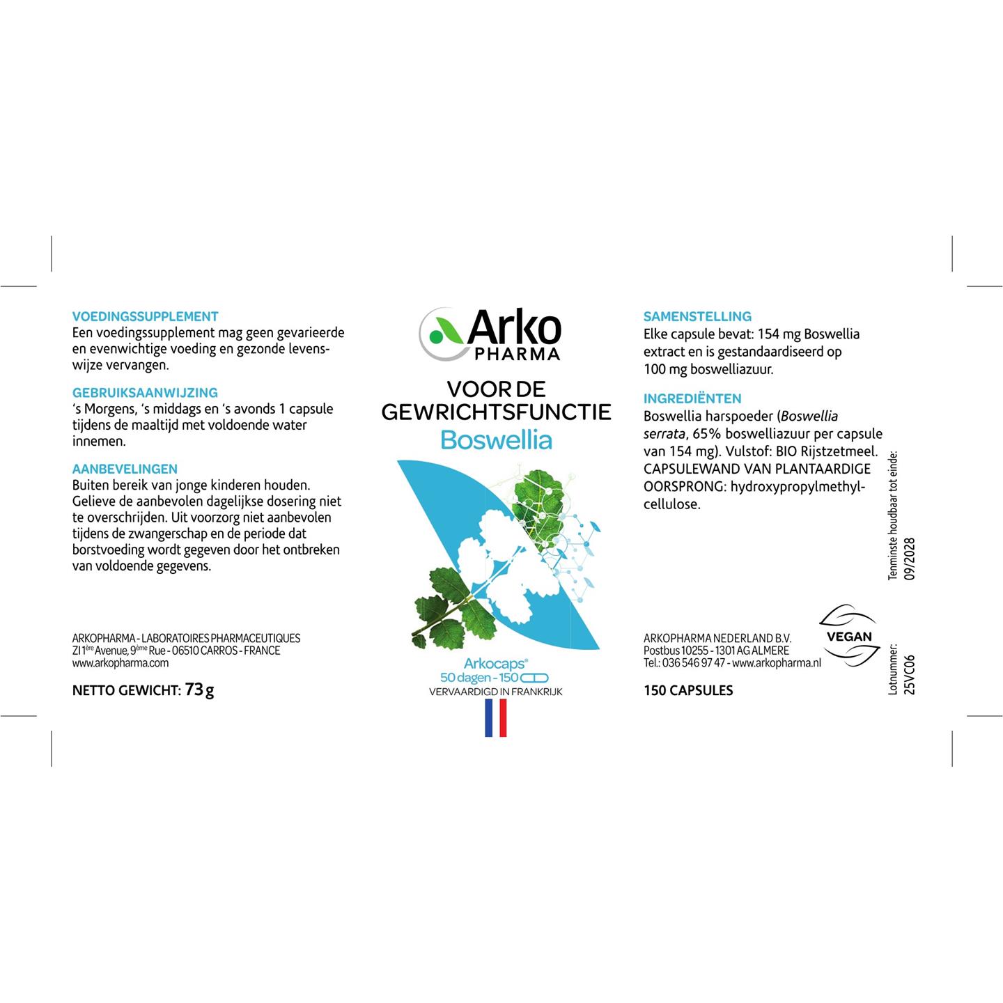 Boswellia harspoeder (Boswellia serrata, 65% boswelliazuur per capsule van 154 mg), Vulstof (BIO Rijstzetmeel), Capsule van plantaardige oorsprong (Hydroxypropylmethylcellulose).
