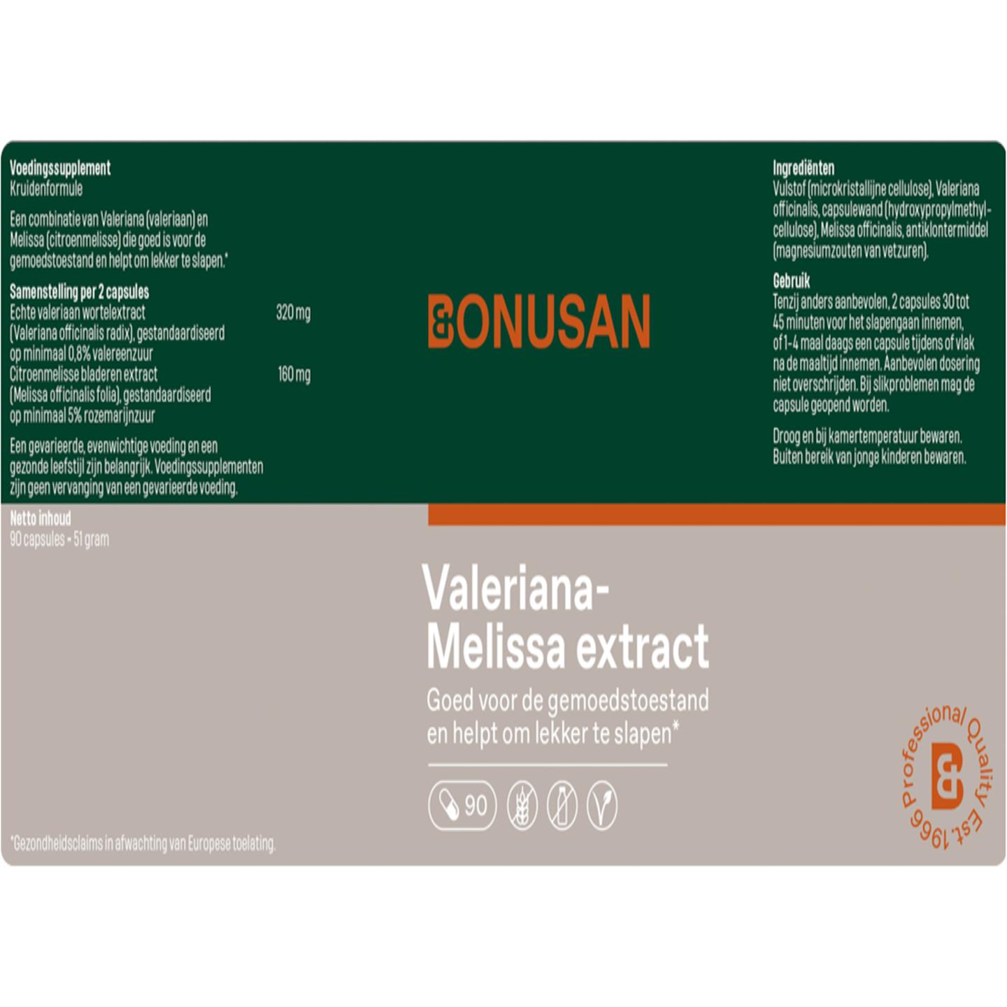 Vulstof (Microkristallijne cellulose), Valeriana officinalis, Capsulewand (Hydroxypropylmethylcellulose), Melissa officinalis, Antiklontermiddel (Magnesiumzouten van vetzuren).