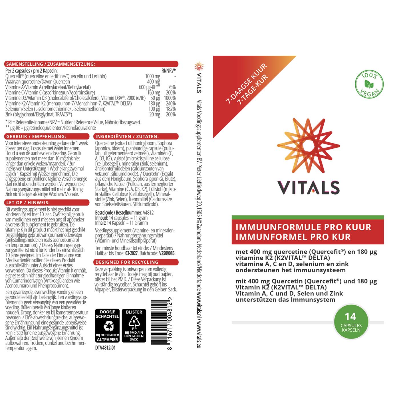 Quercetine (extract uit honingboom, Sophora japonica, bloem), Plantaardige capsule (Pullulan, uit gefermenteerd zetmeel), Vitaminen (C, A, D3, K2), Vulstof (Microkristallijne cellulose (cellulosegel)), Mineralen (Zink, Selenium), Antiklontermiddelen (Calciumzouten van vetzuren, Siliciumdioxide).