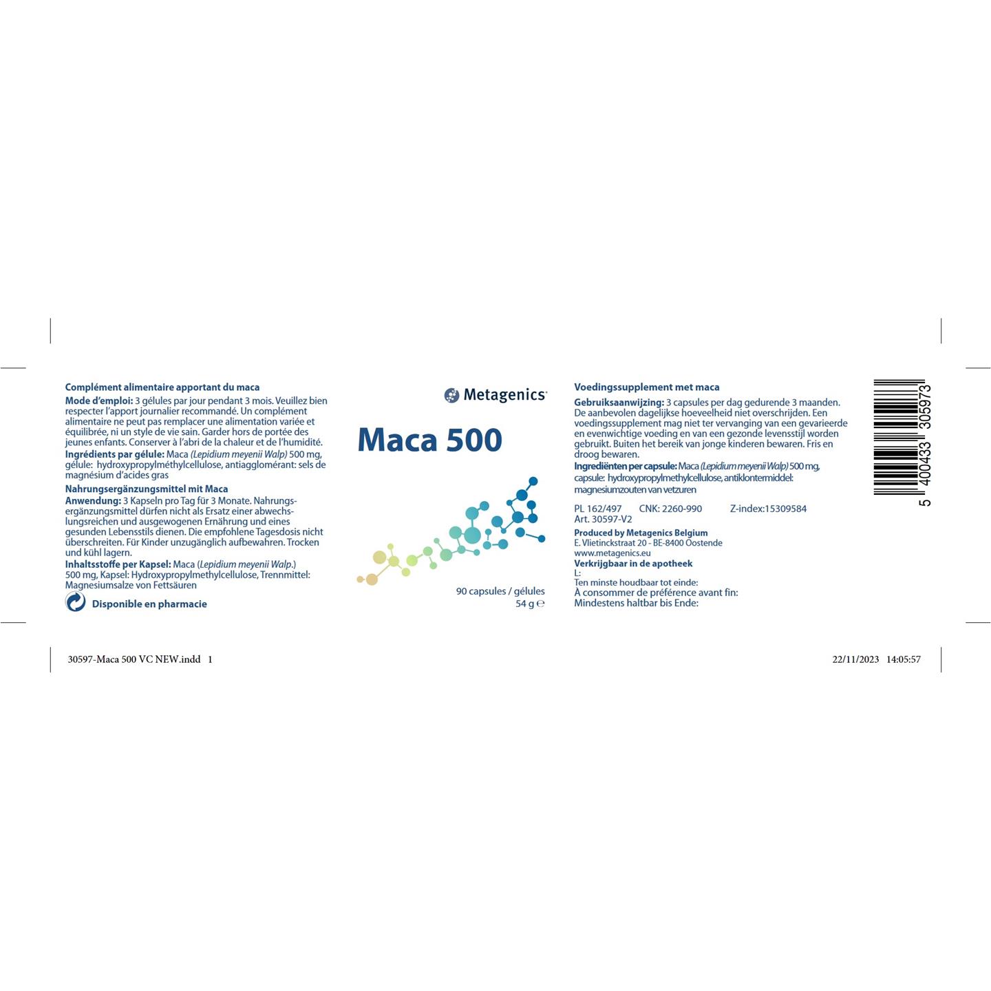 Maca (Lepidium meyenii Walp), Capsule (Hydroxypropylmethylcellulose), Antiklontermiddel (Magnesiumzouten van vetzuren).