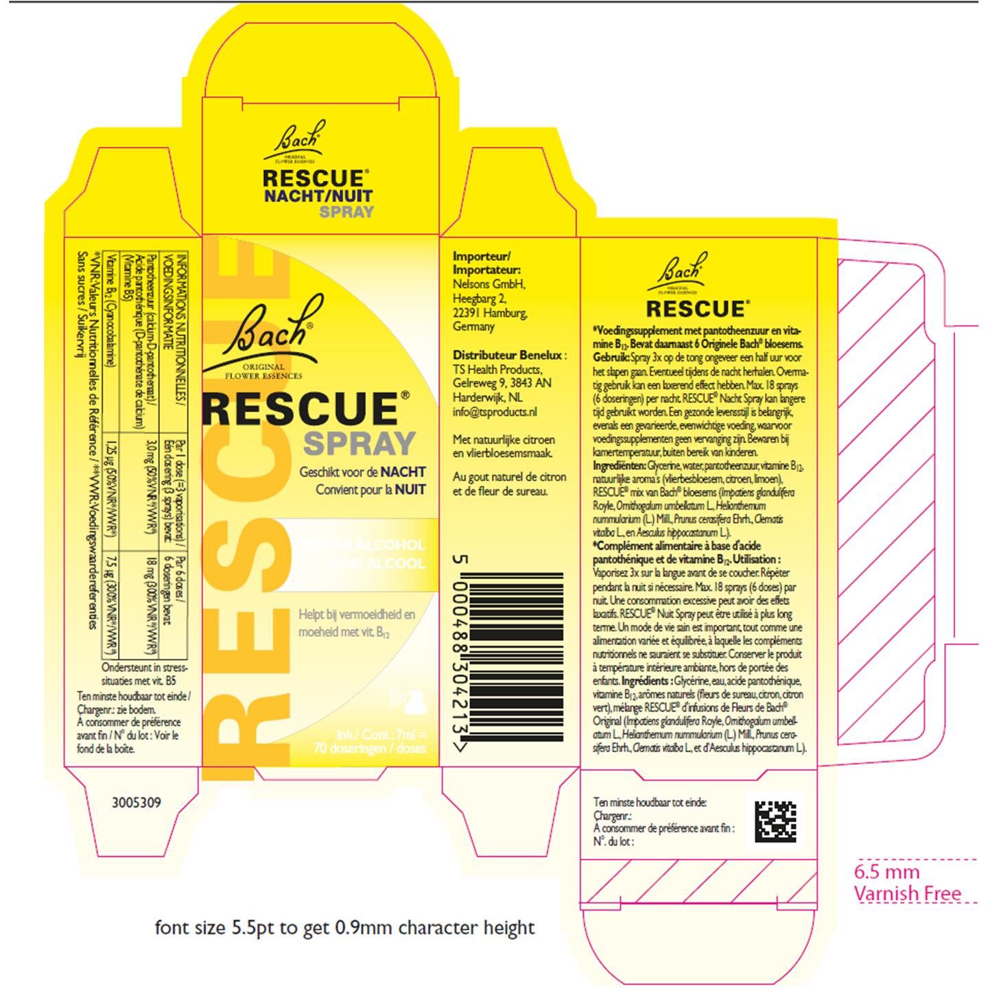 Spray 3 maal op de tong ongeveer een half uur voor het slapen gaan. Eventueel tijdens de nacht herhalen. Maximaal 18 sprays (6 doseringen) per nacht. Rescue® Nacht Spray kan langere tijd gebruikt worden.