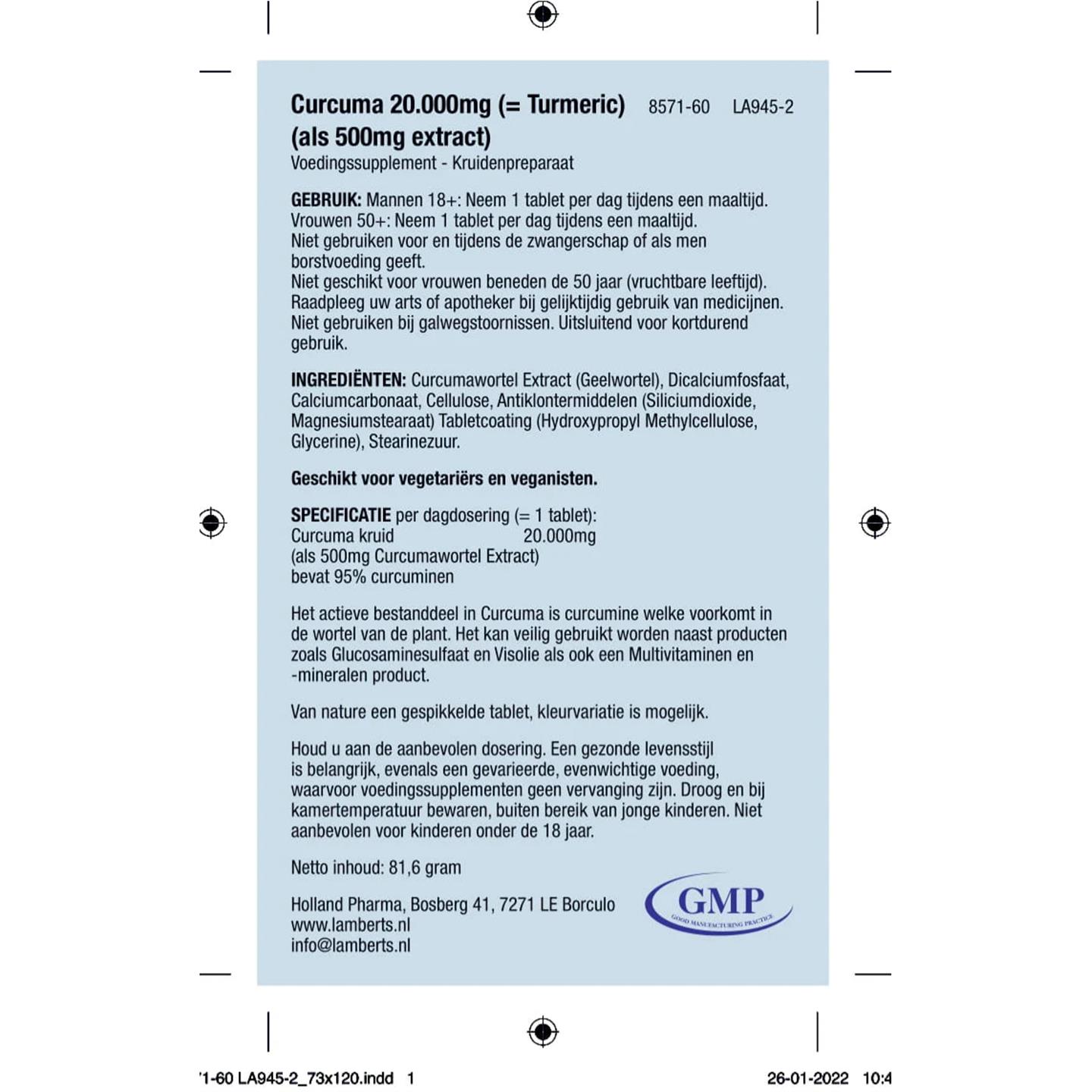 Curcumawortel (Geelwortel) extract, Dicalciumfosfaat, Calciumcarbonaat, Cellulose, Antiklontermiddelen (Siliciumdioxide, Magnesiumstearaat), Tabletcoating (Hydroxypropylmethylcellulose, Glycerine), Stearinezuur.