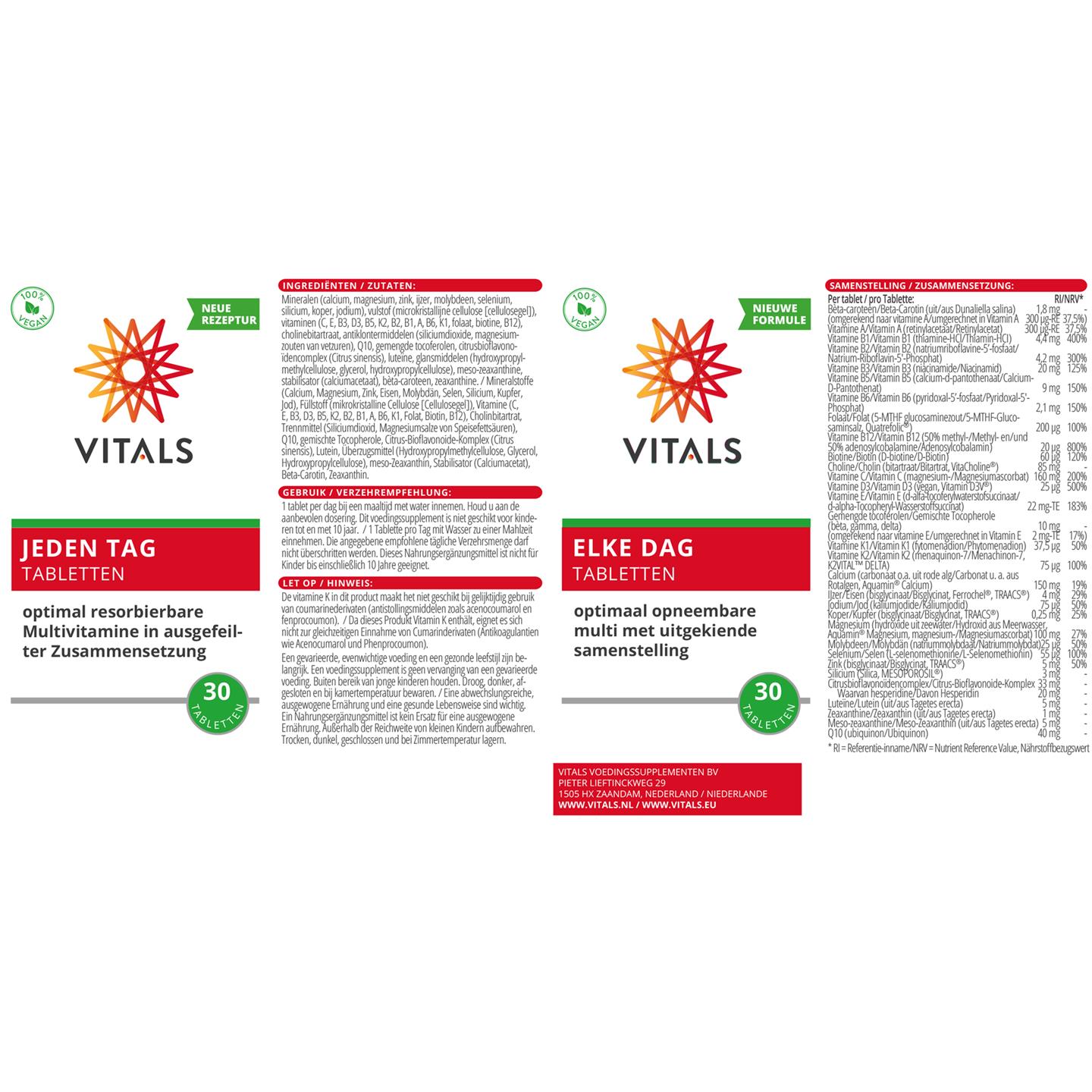 Mineralen (Calcium, Magnesium, Zink, IJzer, Molybdeen, Selenium, Silicium, Koper, Jodium), Vulstof (Microkristallijne cellulose (cellulosegel)), Vitaminen (C, E, B3, D3, B5, K2, B2, B1, A, B6, K1, folaat, biotine, B12), Cholinebitartraat, Antiklontermiddelen (Siliciumdioxide, Magnesiumzouten van vetzuren), Q10, Gemengde tocoferolen, Citrusbioflavonoïdencomplex (Citrus sinensis), Luteïne, Glansmiddelen (Hydroxypropylmethylcellulose, Glycerol, Hydroxypropylcellulose), Meso-zeaxanthine, Stabilisator (Calciumacetaat), Bèta-caroteen, Zeaxanthine.