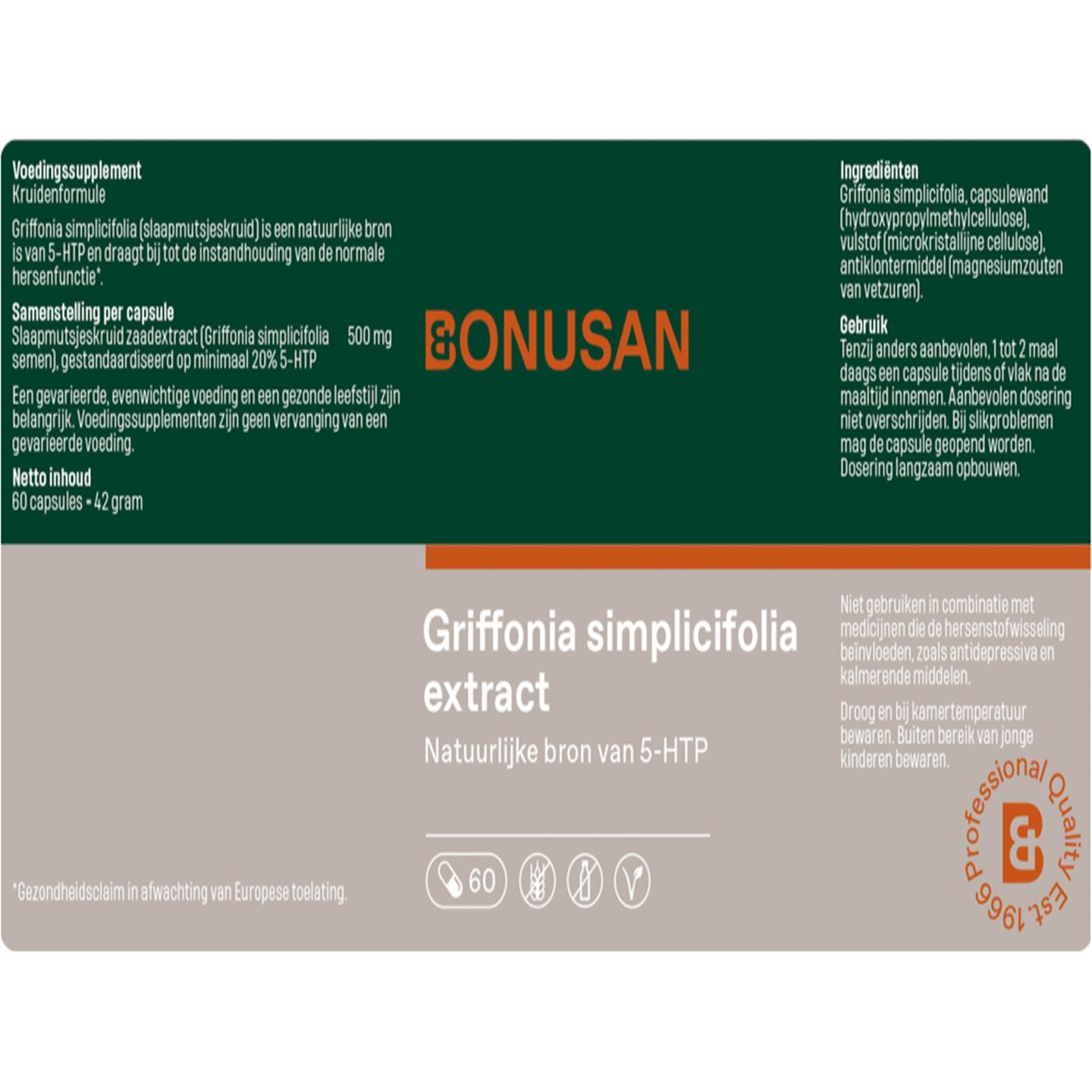 Griffonia simplicifolia, Capsulewand (Hydroxypropylmethylcellulose), Vulstof (Microkristallijne cellulose), Antiklontermiddel (Magnesiumzouten van vetzuren).