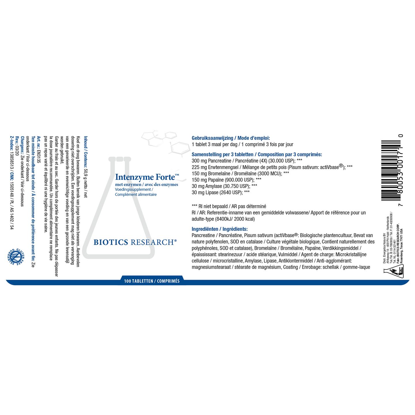 Pancreatine, Erwtenmengsel (Pisum sativum: actiVbase®), Bromelaïne, Papaïne, Bindmiddel (Stearinezuur), Vulstof (Microkristallijne cellulose), Amylase, Lipase, Antiklontermiddel (Magnesiumstearaat), Coating (Schellak).