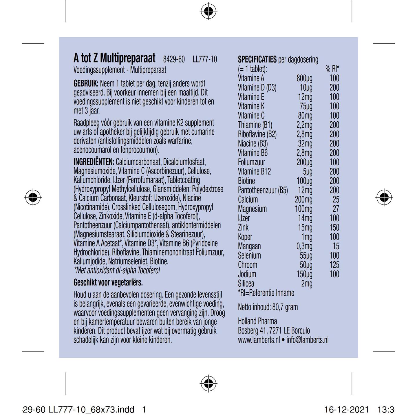 Calciumcarbonaat, Dicalciumfosfaat, Magnesiumoxide, Vitamine C (ascorbinezuur), Cellulose, Kaliumchloride, IJzer (ferrofumaraat), Tabletcoating (Hydroxypropylmethylcellulose, Glansmiddelen: Polydextrose, Calciumcarbonaat, Kleurstof: IJzeroxide), Niacine (nicotinamide), Crosslinked cellulosegom, Hydroxypropylcellulose, Zinkoxide, Vitamine E (d-alfa-tocoferol), Pantotheenzuur (calciumpantothenaat), Antiklontermiddelen (Magnesiumzouten van vetzuren, Siliciumdioxide, Stearinezuur), Vitamine A acetaat (Antioxidant: Dl-alfa-tocoferol), Vitamine D3 (Antioxidant: Dl-alfa-tocoferol), Vitamine B6 (pyridoxine hydrochloride), Riboflavine, Thiaminemononitraat, Kopersulfaat, Chroomchloride, Vitamine K1, Mangaansulfaat, Vitamine B12 (cyanocobalamine), Foliumzuur, Kaliumjodide, Natriumseleniet, Biotine.
