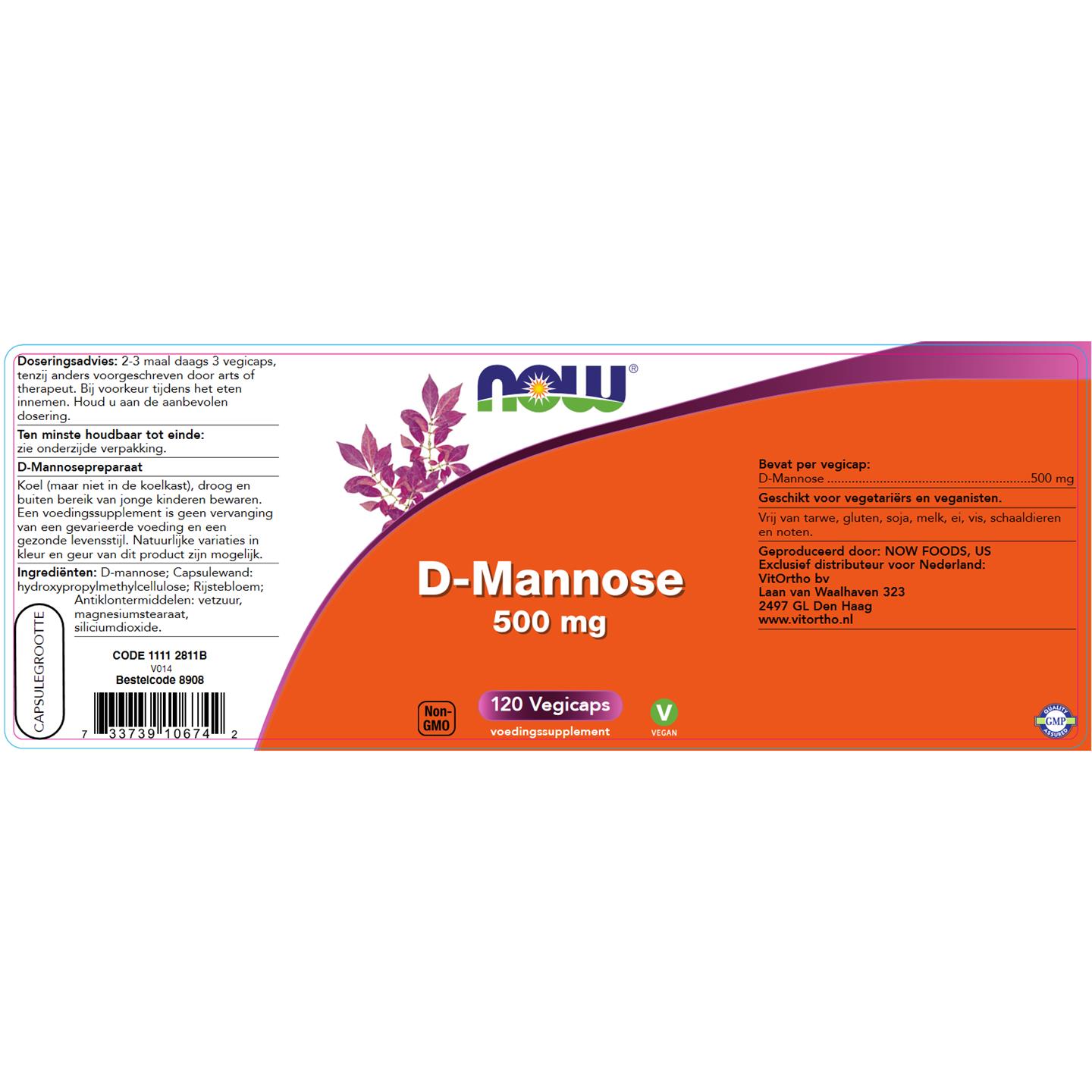 D-Mannose, Capsule (Hydroxypropylmethylcellulose), Rijstebloem, Antiklontermiddelen (Vetzuur, Magnesiumstearaat, Siliciumdioxide).