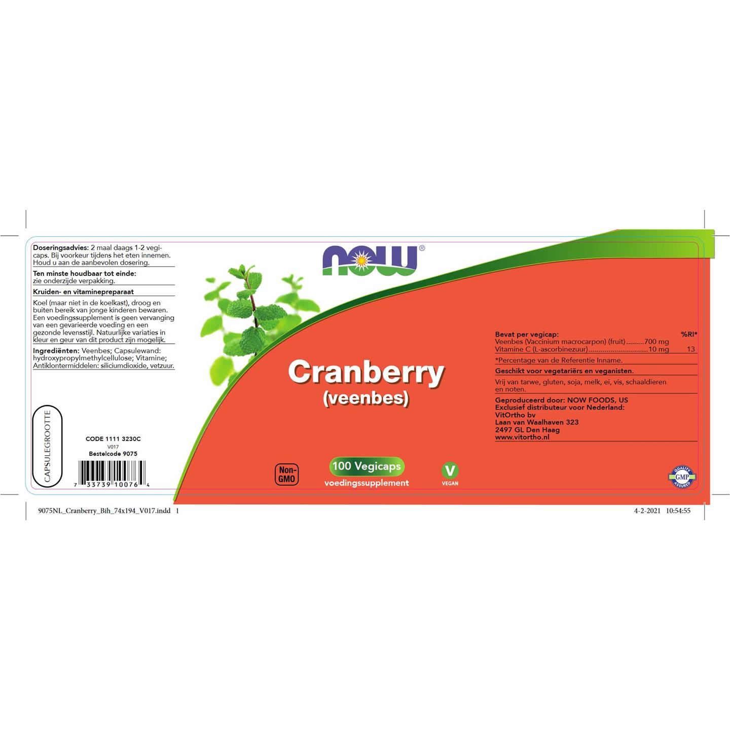 Veenbes (Vaccinium macrocarpon) vrucht, Capsule (Hydroxypropylmethylcellulose), Vitamine C (ascorbinezuur), Antiklontermiddelen (Siliciumdioxide, Vetzuur).