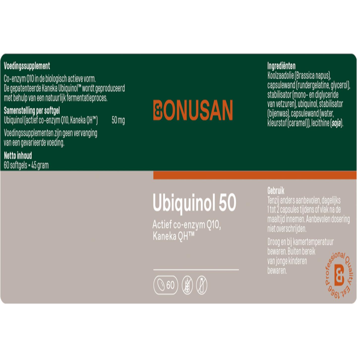 Koolzaadolie (Brassica napus), Capsulewand (Rundergelatine, Glycerol), Stabilisator (Mono- en diglyceriden van vetzuren), Ubiquinol, Stabilisator (Bijenwas), Capsulewand (Water, Kleurstof: Caramel), Lecithine (Soja).