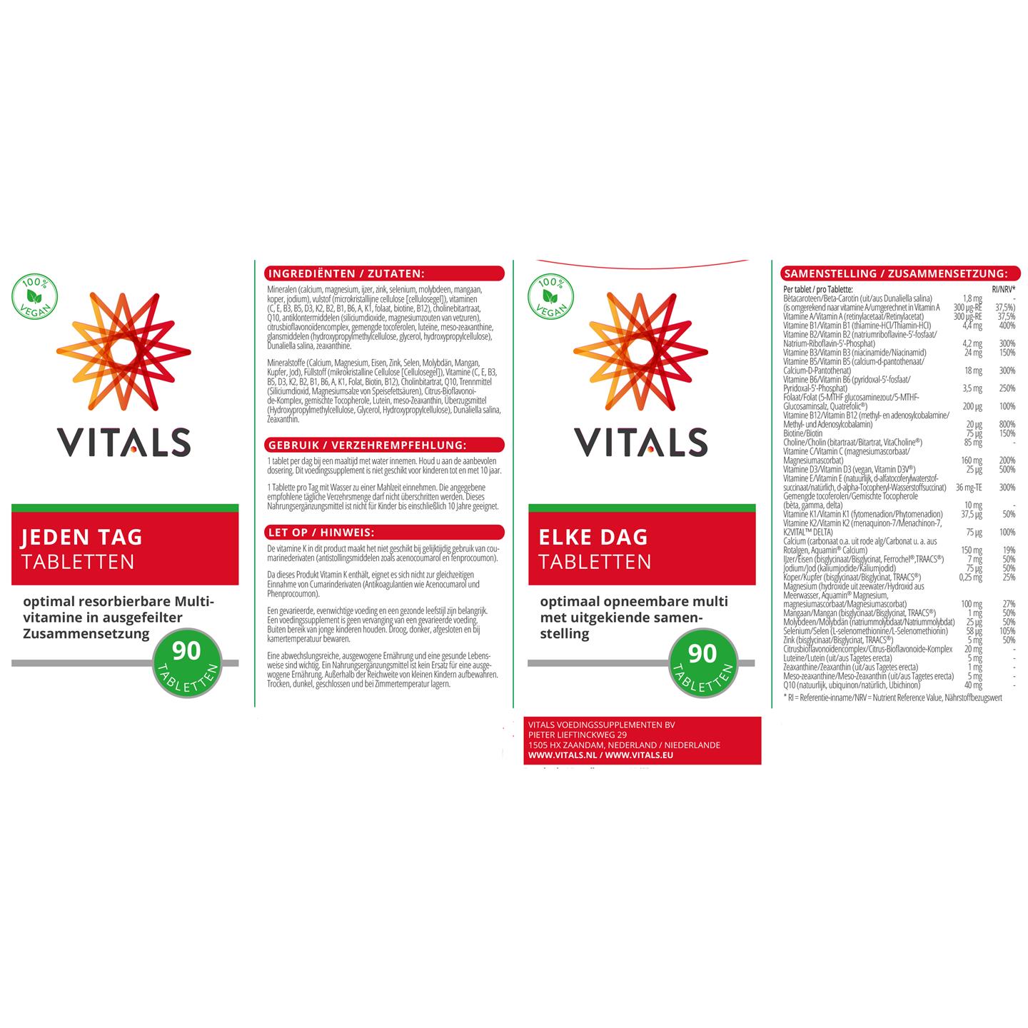 Mineralen (Calcium, Magnesium, IJzer, Zink, Selenium, Molybdeen, Mangaan, Koper, Jodium), Vulstof (Microkristallijne cellulose (cellulosegel)), Vitaminen (C, E, B3, B5, D3, K2, B2, B1, B6, A, K1, Folaat, Biotine, B12), Cholinebitartraat, Q10, Antiklontermiddelen (Siliciumdioxide, Magnesiumzouten van vetzuren), Citrusbioflavonoïdencomplex, Gemengde tocoferolen, Luteïne, Meso-zeaxanthine, Glansmiddelen (Hydroxypropylmethylcellulose, Glycerol, Hydroxypropylcellulose), Dunaliella salina, Zeaxanthine.