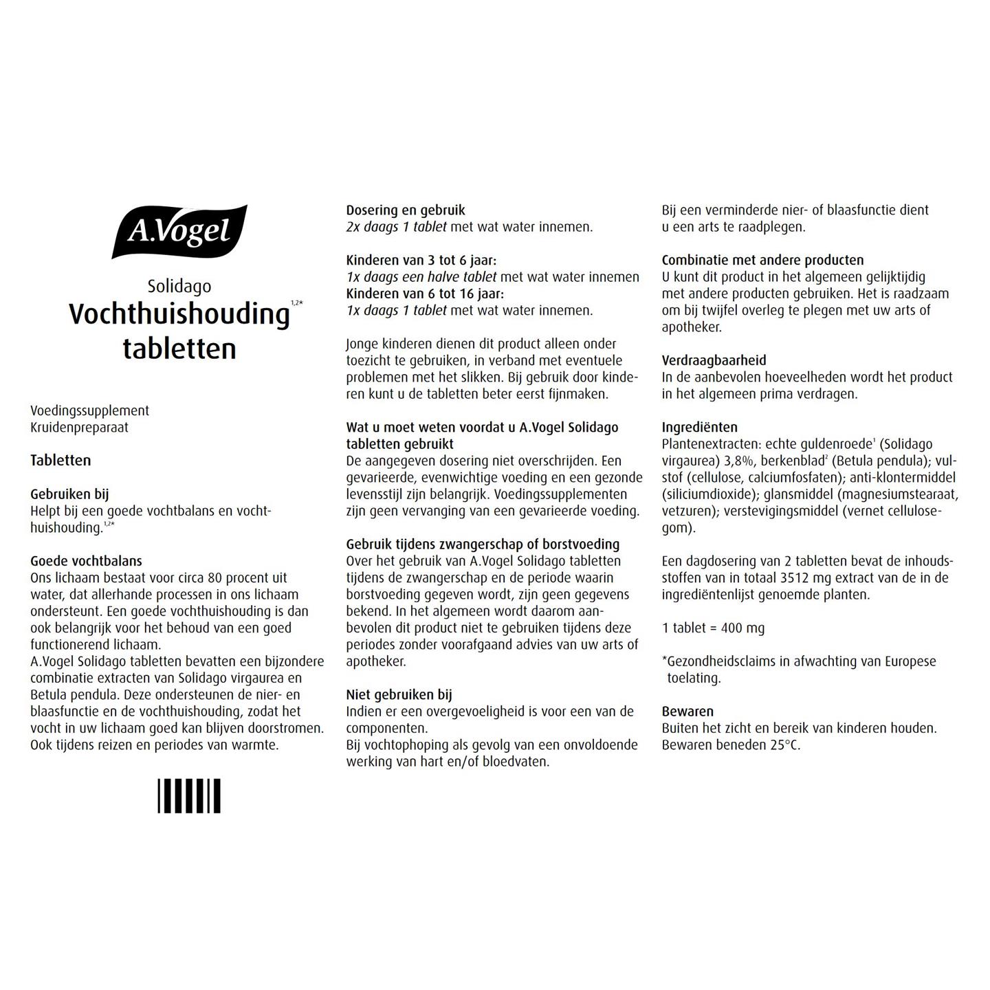 Plantenextracten: Echte guldenroede (Solidago virgaurea), Berkenblad (Betula pendula), Vulstof (Cellulose, Calciumfosfaten), Antiklontermiddel (Siliciumdioxide), Glansmiddel (Magnesiumstearaat, Vetzuren), Verstevigingsmiddel (Vernet cellulosegom).